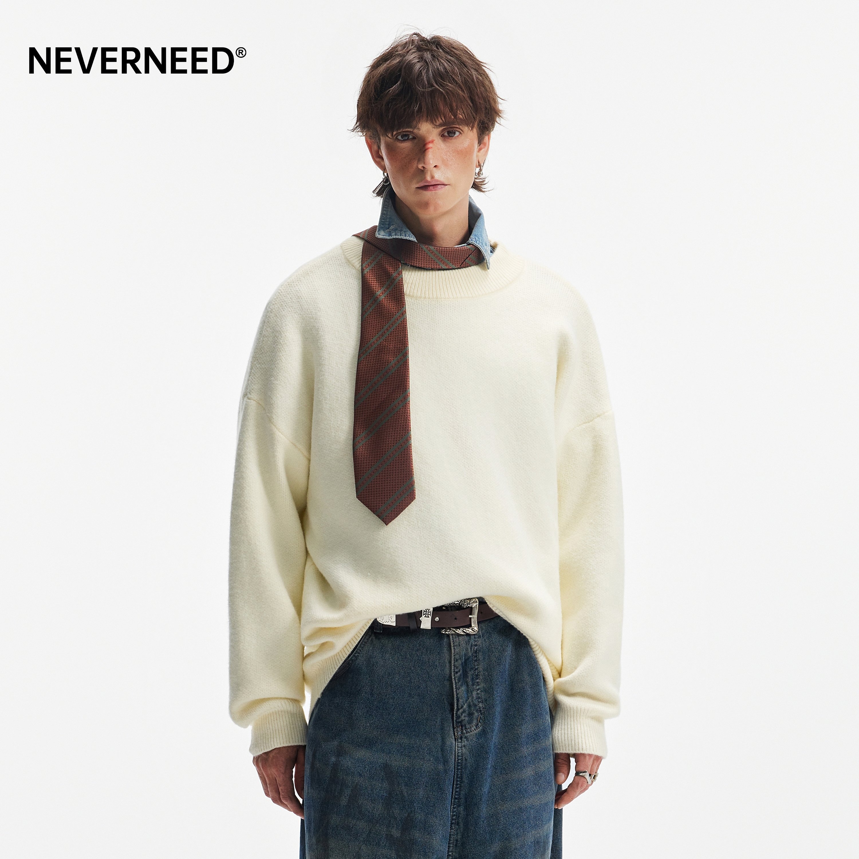 NEVERNEED纯色圆领套头毛衣男女秋季美式慵懒风休闲内搭针织衫潮