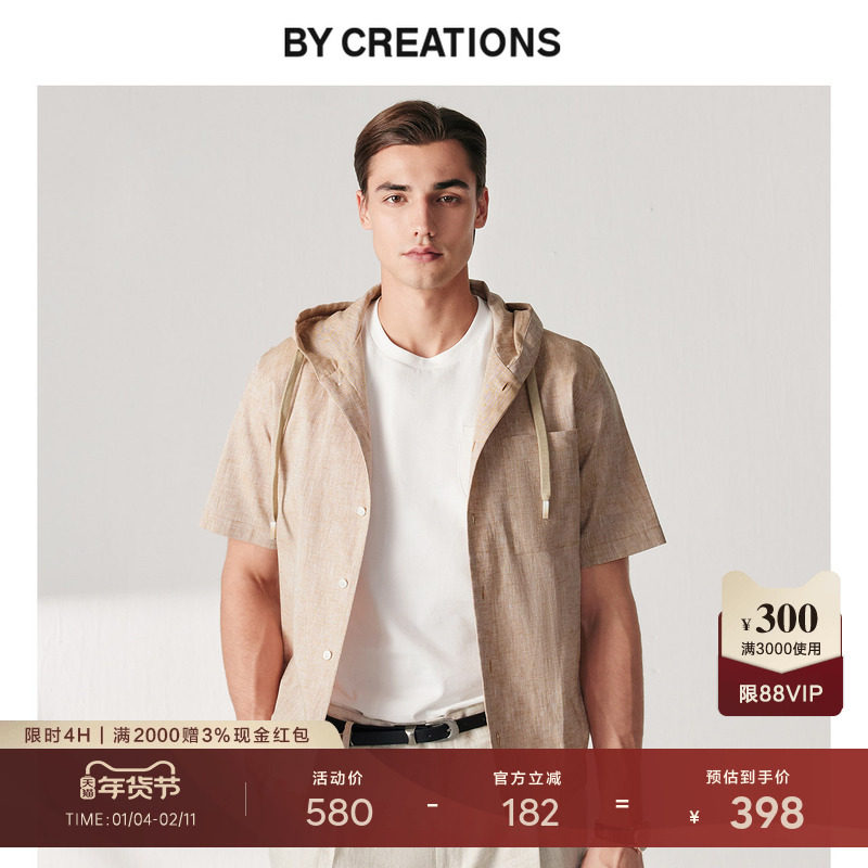 【亚麻】柏品连帽短袖衬衫男士秋新品商务休闲透气凉爽上衣短外套