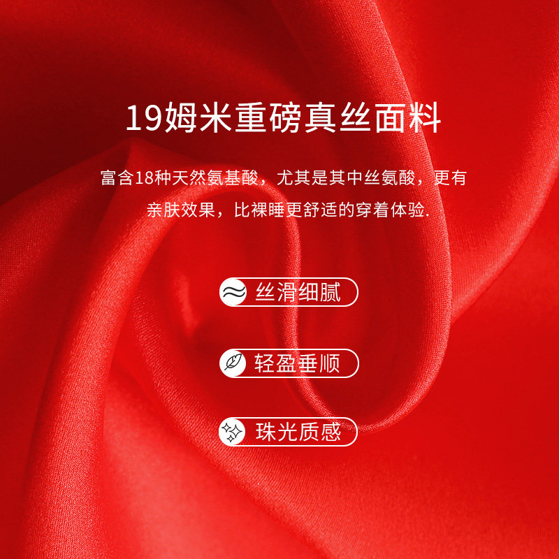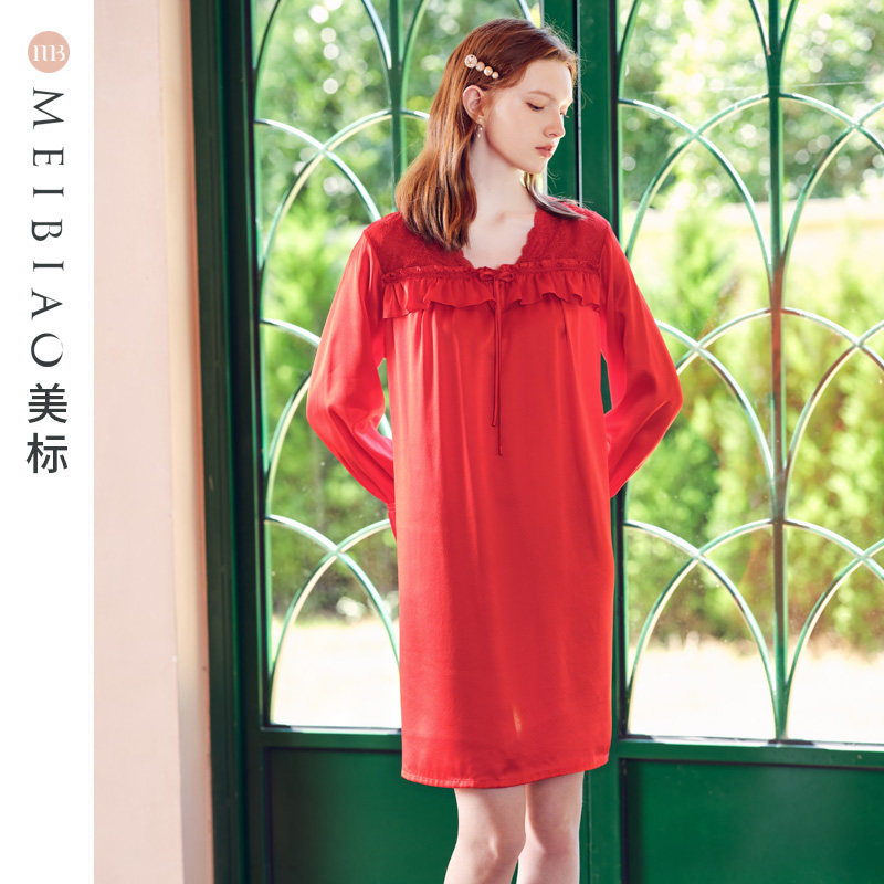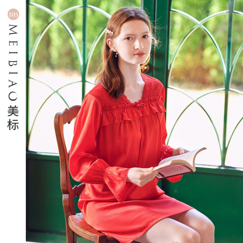 美标重磅长袖真丝睡裙女春秋桑蚕丝睡衣宫廷风红色本命年家居服夏