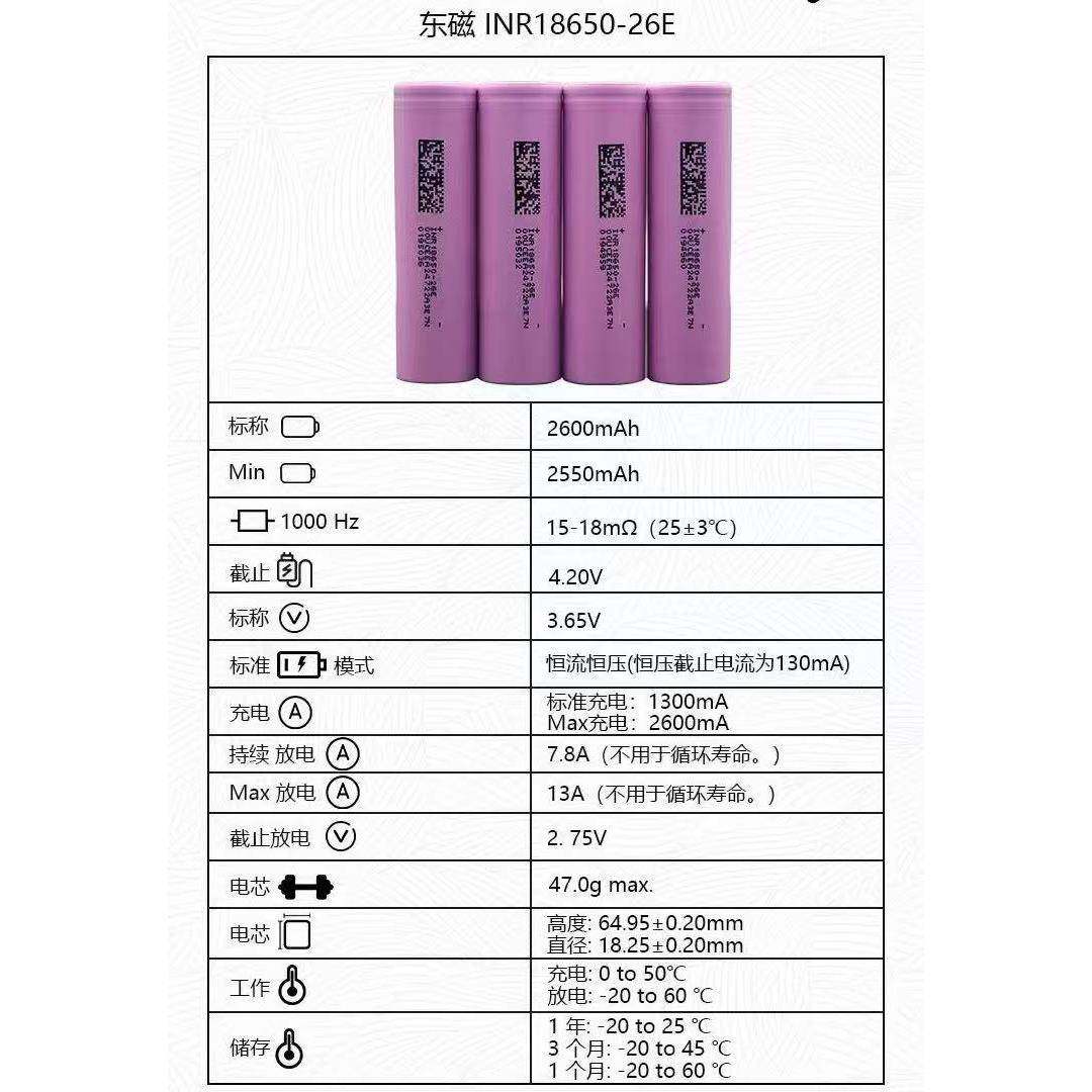 东磁26E18650锂电池2600mAh5C动力电动车三轮车电动工具代驾车