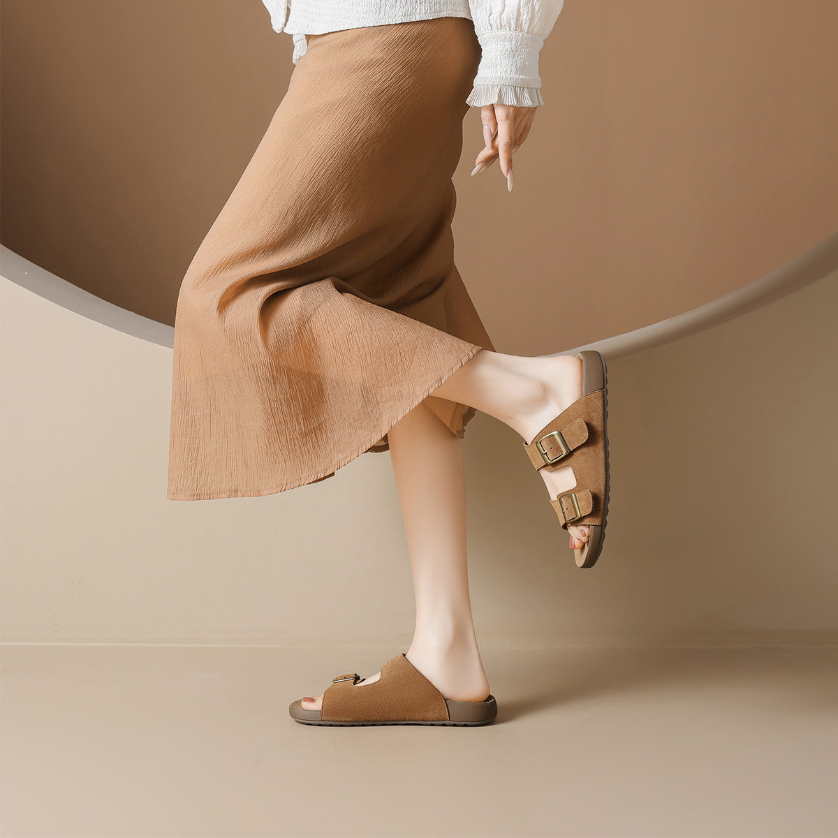 真皮~骄屿法式复古坡跟两穿露趾凉鞋女新款一字带方头露趾凉拖鞋