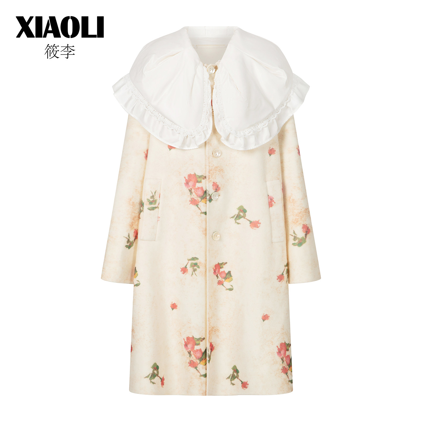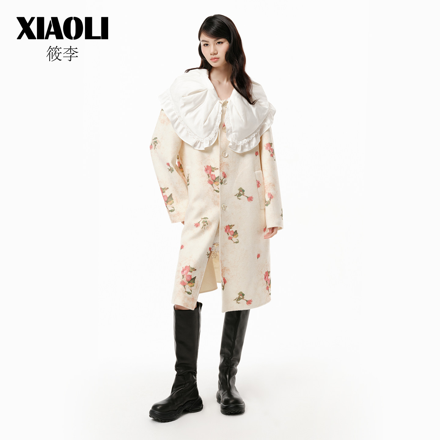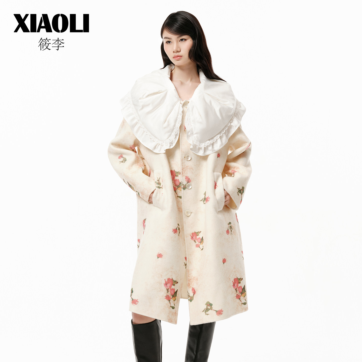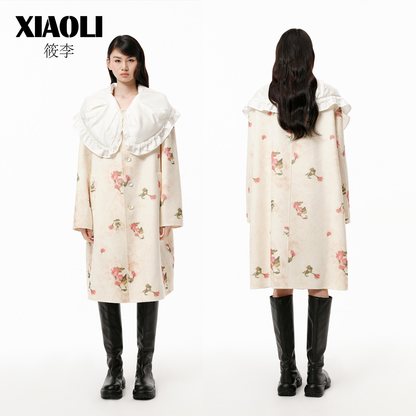 【XIAOLI筱李】秋冬新品可脱卸真丝花瓣领印花双面尼大衣外套25年