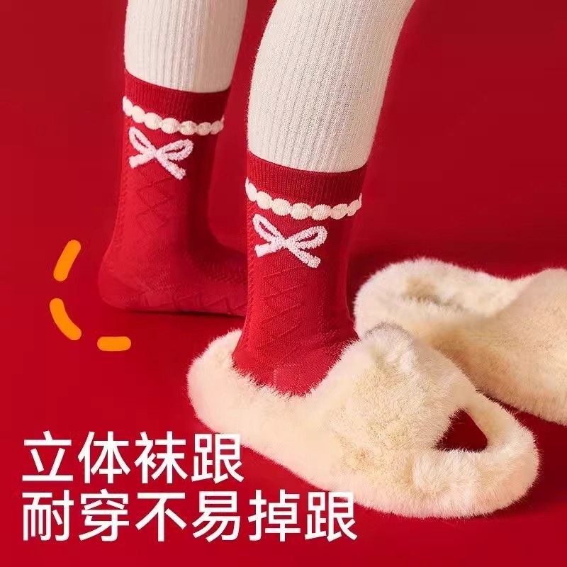 女童袜子纯棉本命年红色棉袜女孩马年新年大红袜冬款加厚童袜公主