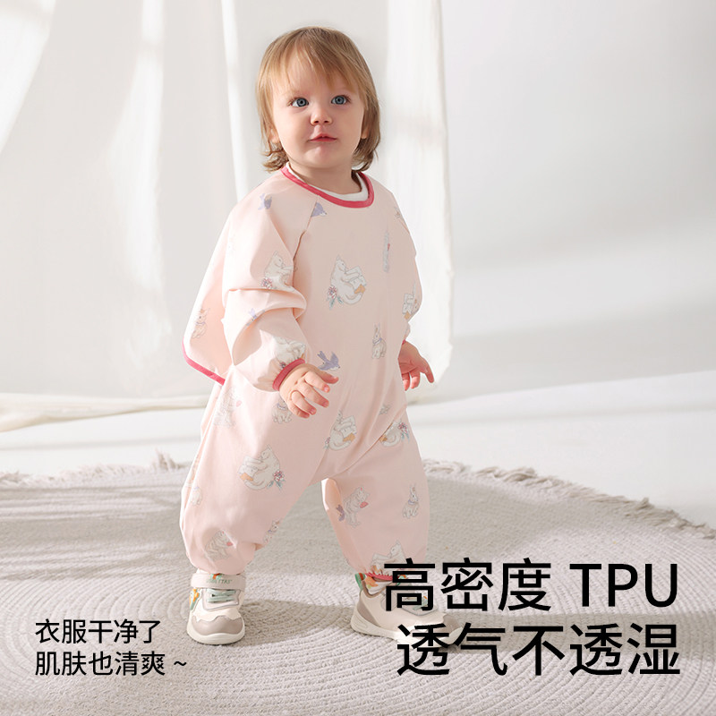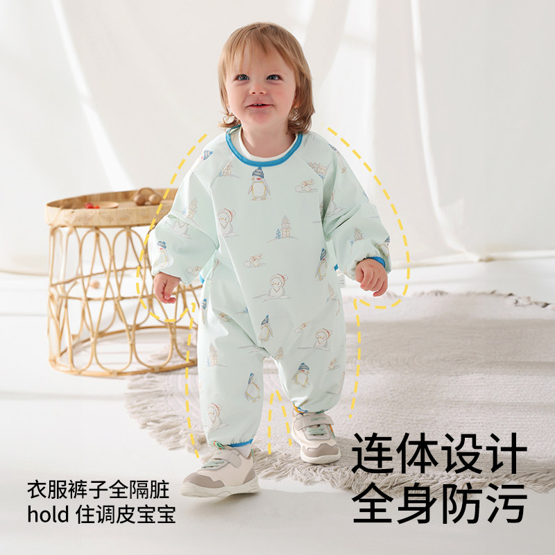 贝肽斯宝宝连体罩衣吃饭防水防脏婴儿爬行辅食围兜儿童围裙爬爬服