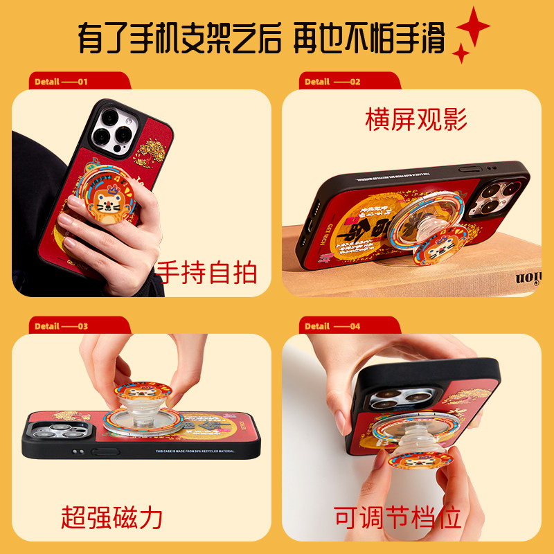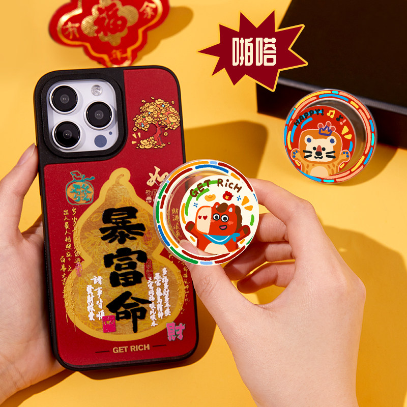 原创磁吸气囊手机支架伸缩狮子折叠便携背贴指环旋转新年马上有钱