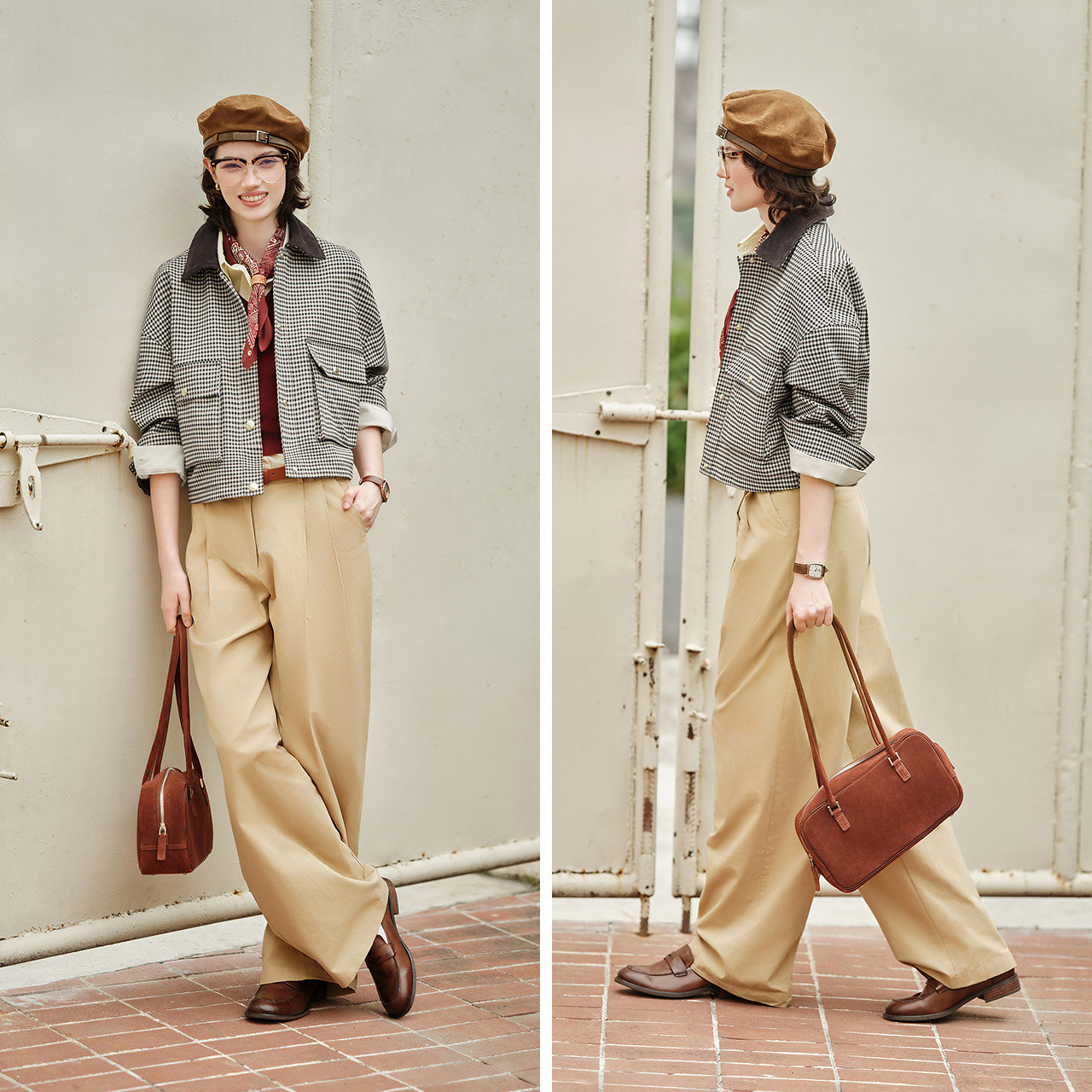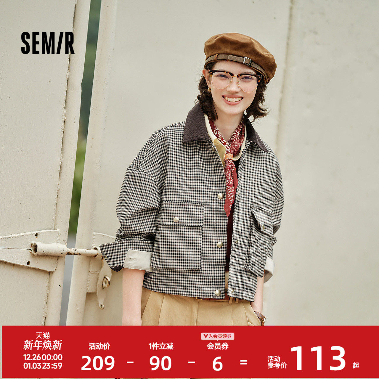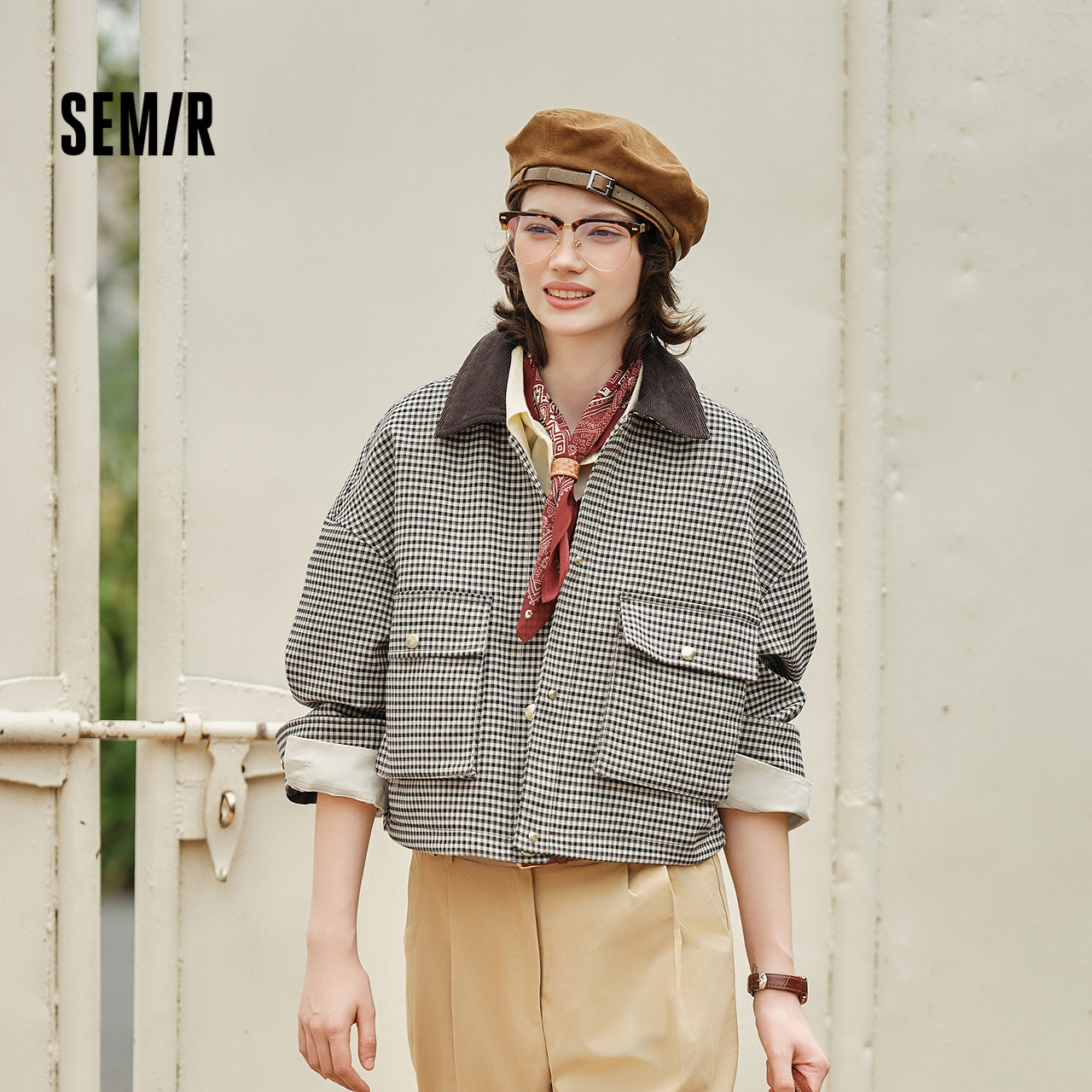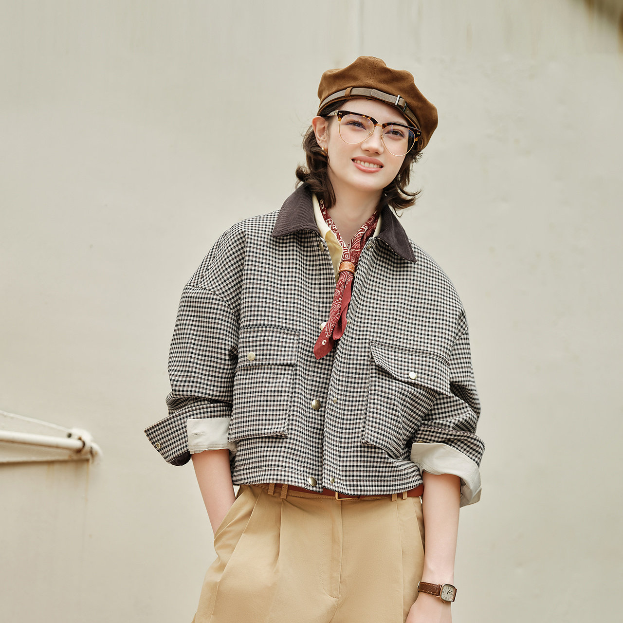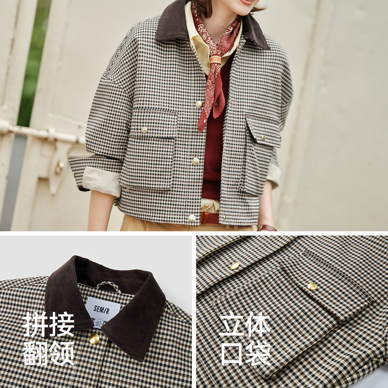 森马外套女短款拼接灯芯绒翻领潮流宽松秋季落肩格纹夹克时尚复古