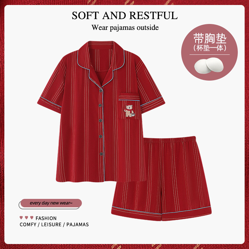 末里末【条纹小熊】2026本命年马年夏纯棉红色情侣结婚睡衣礼盒装