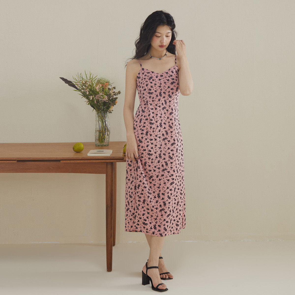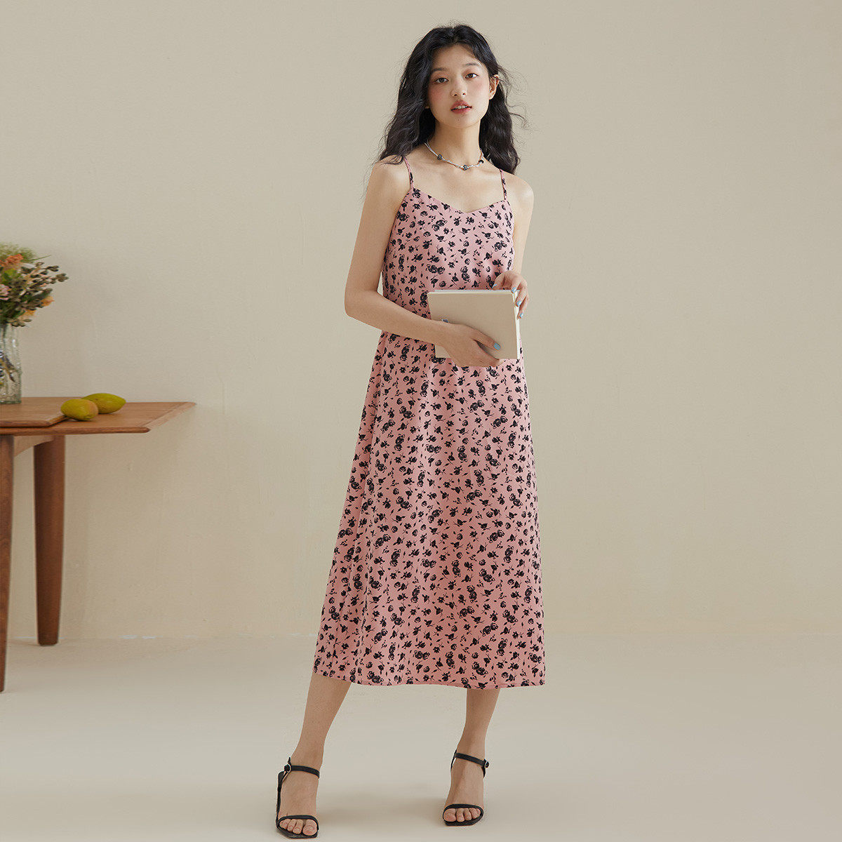 one more碎花吊带连衣裙女2025夏季新款v领高级感法式雪纺长裙子