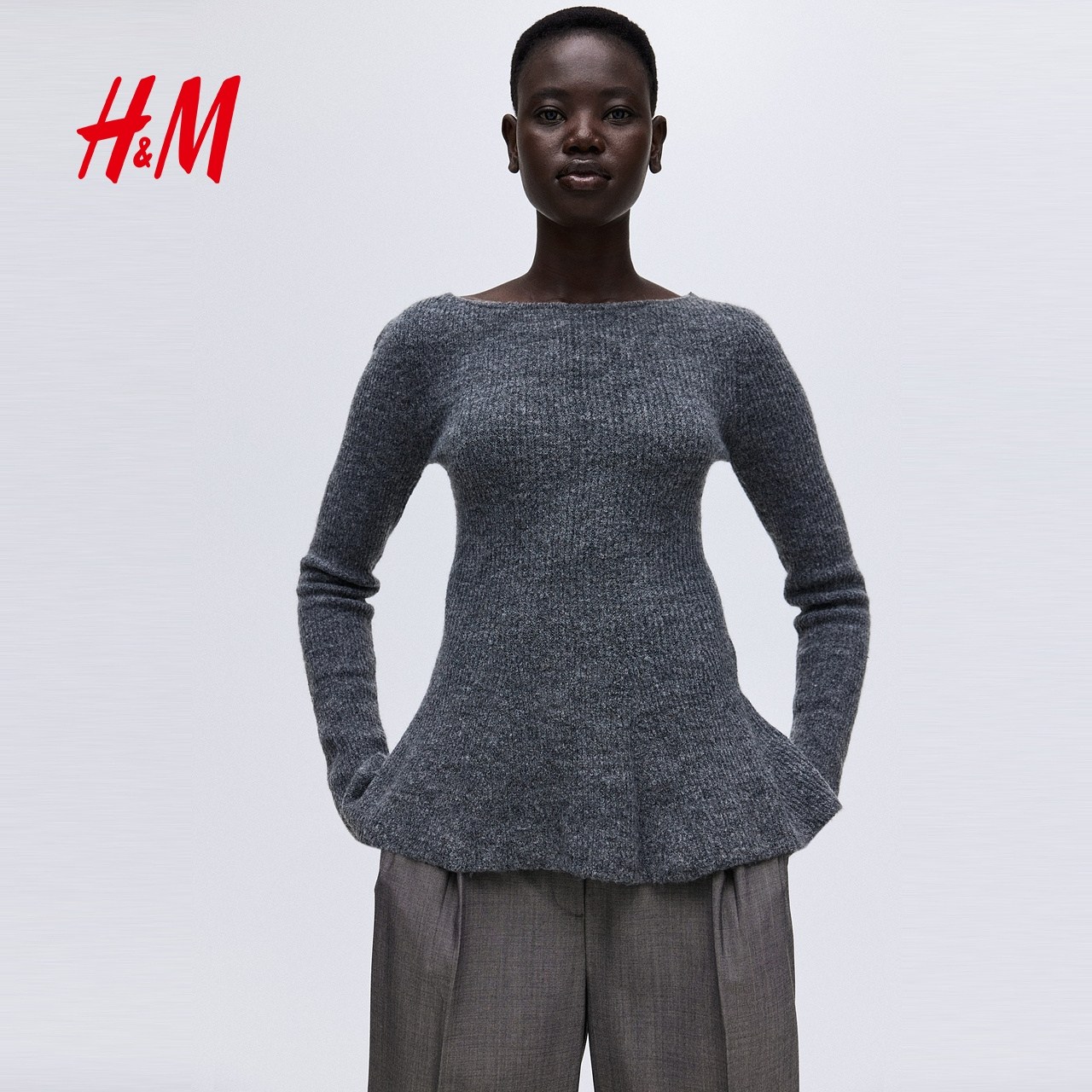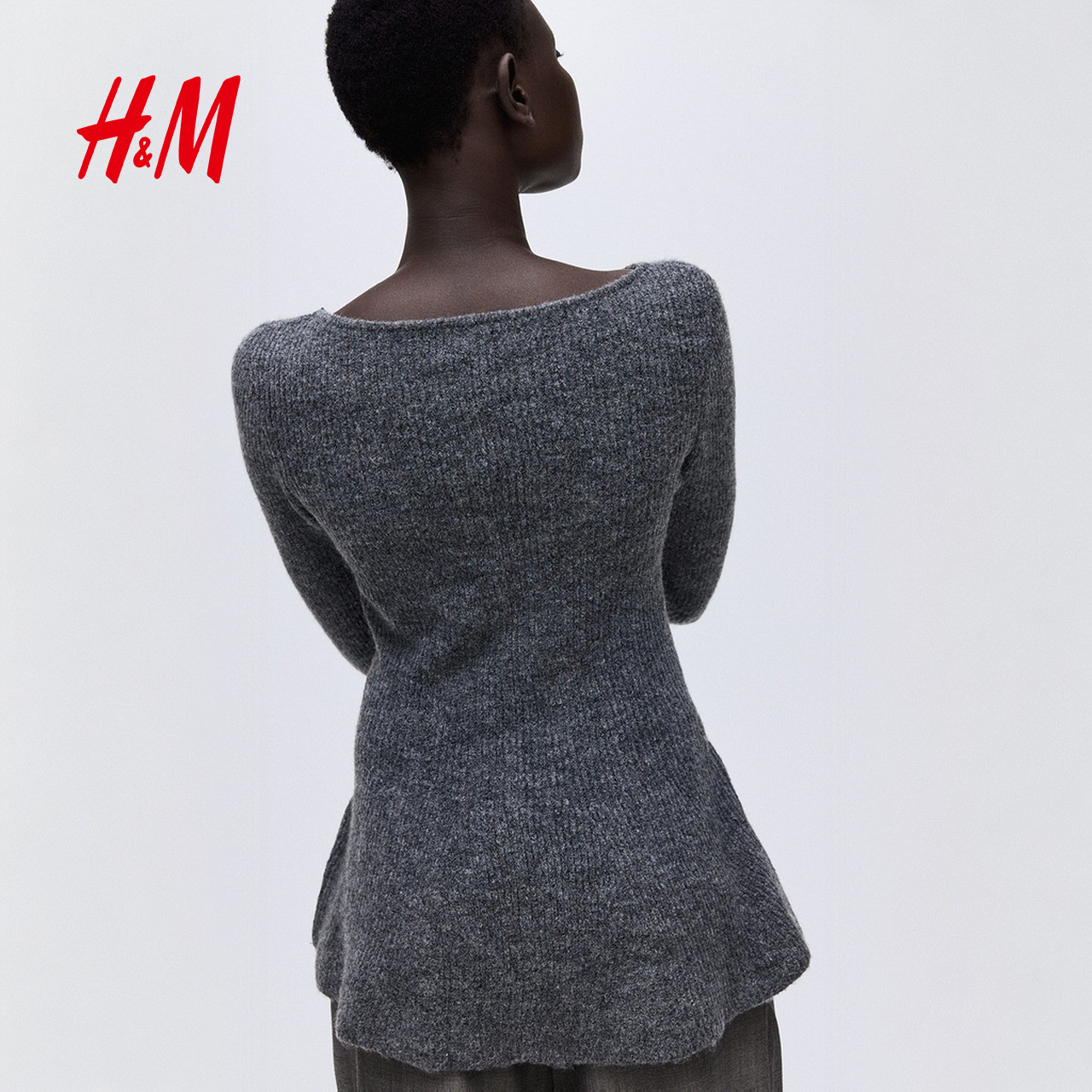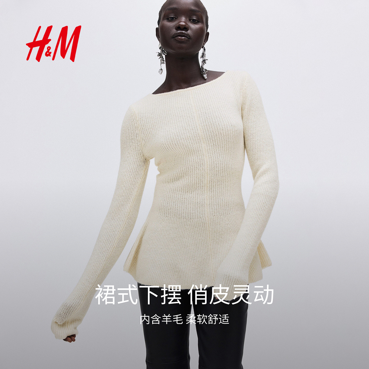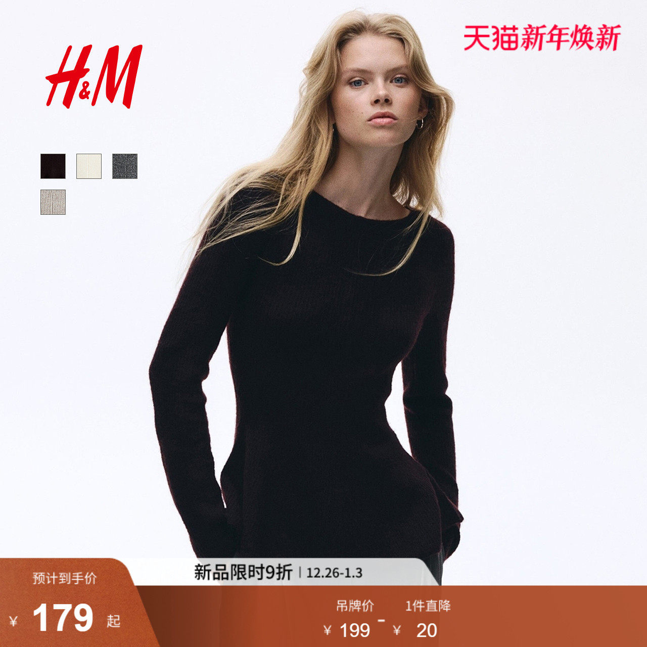 HM女装毛针织衫2025新款酒红色裙式下摆入冬撞色叠穿上衣1303067
