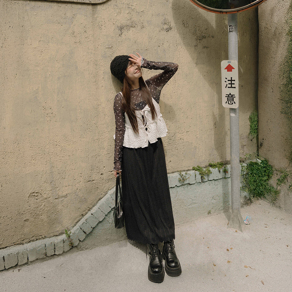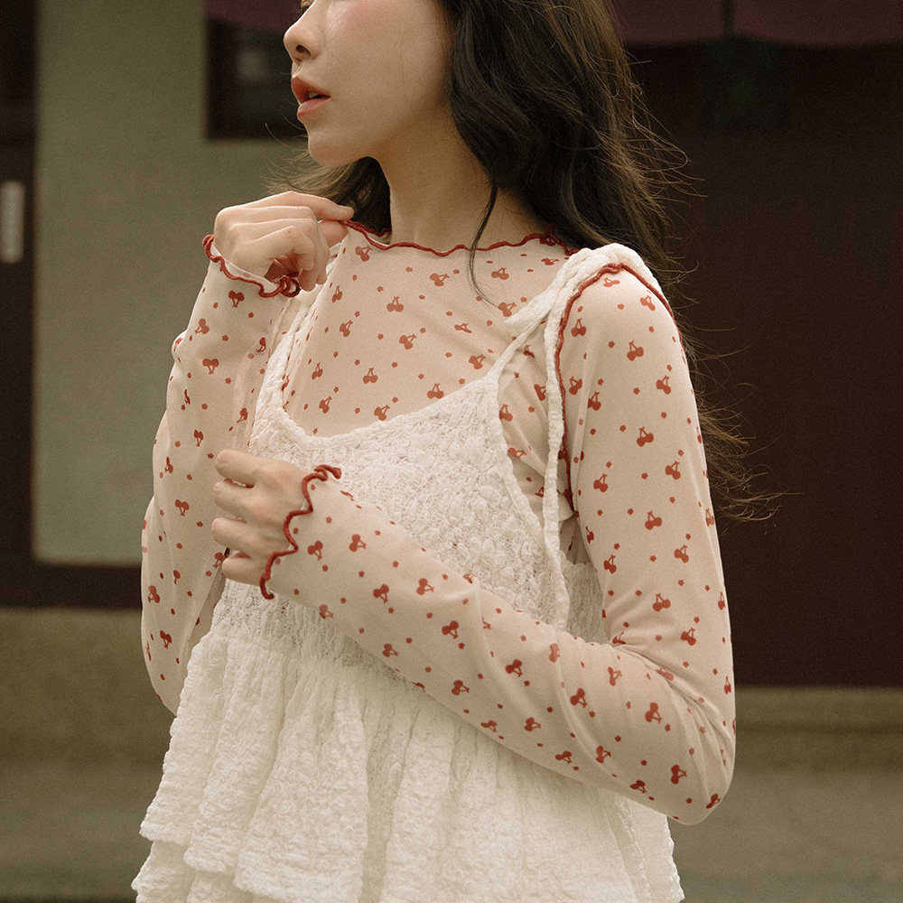 QUEENSHOP 2025秋冬新品女装手绘樱桃木耳边透肤上衣01099292