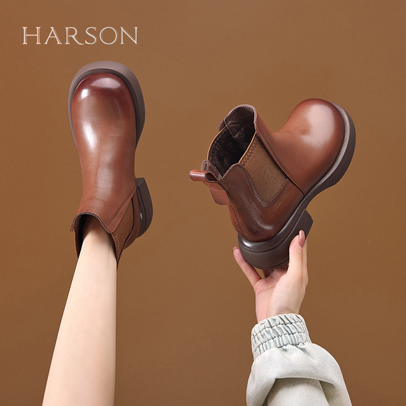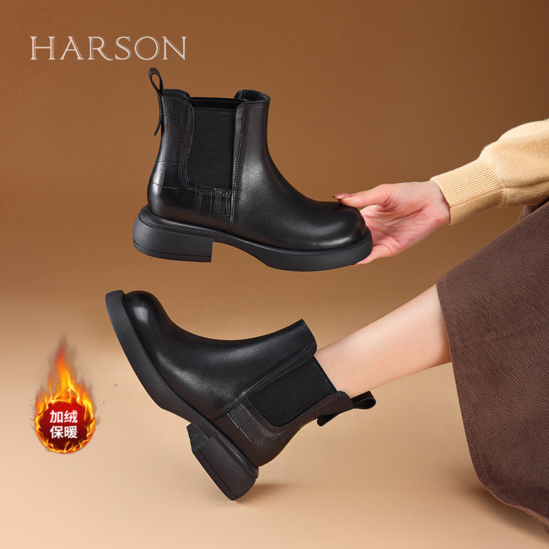 哈森头层牛皮马丁靴女2025冬季新款加绒切尔西短靴时尚百搭烟筒靴
