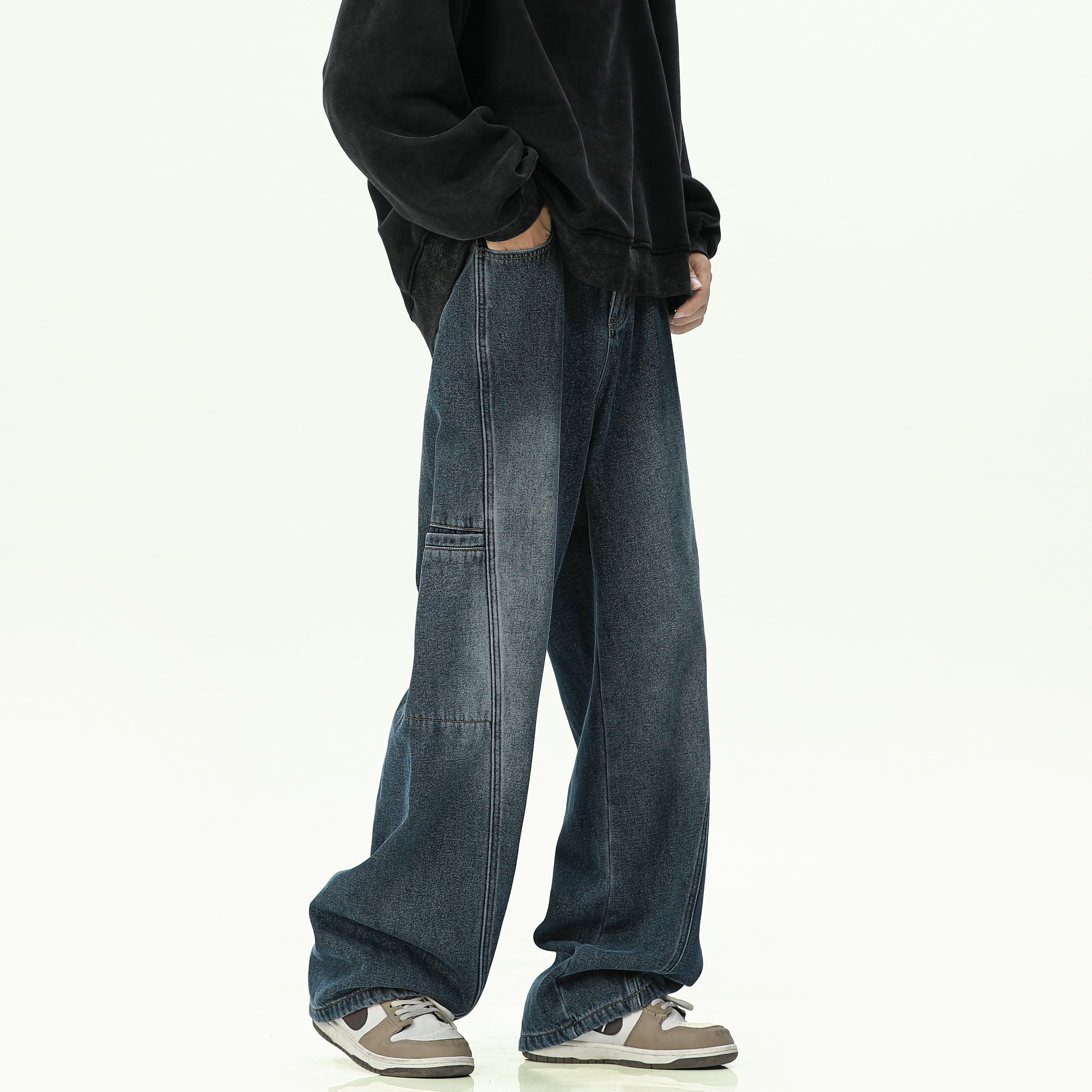 复古直筒牛仔裤男款春季宽松美式百搭裤子潮牌水洗做旧阔腿长裤子