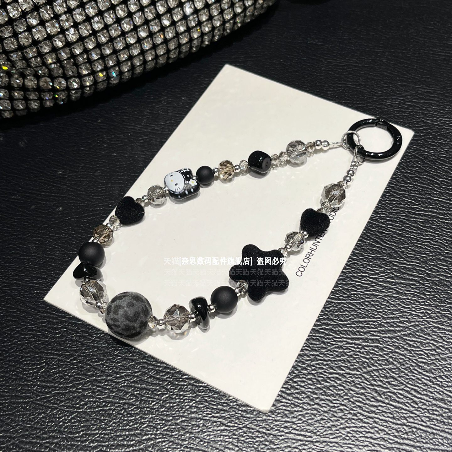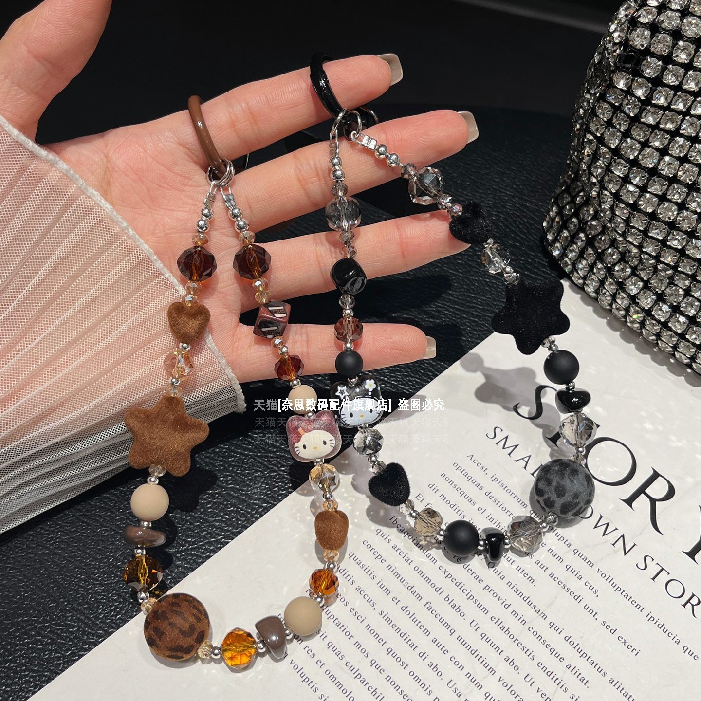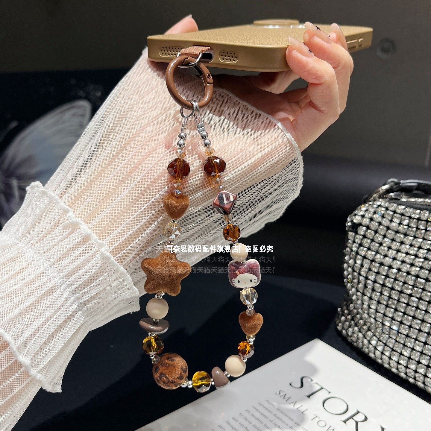 秋冬氛围感豹纹串珠手机链高级磨毛串珠挂链可爱星星猫咪防丢手腕款挂饰链条时尚棕色挂包巨好看水晶手链女壳