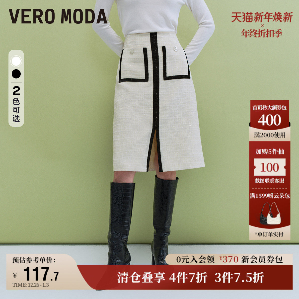 Vero Moda奥莱半身裙秋季新款优雅气质粗花呢黑白简约开衩职业裙