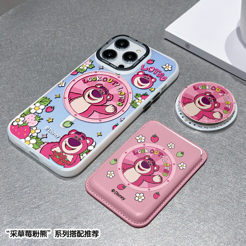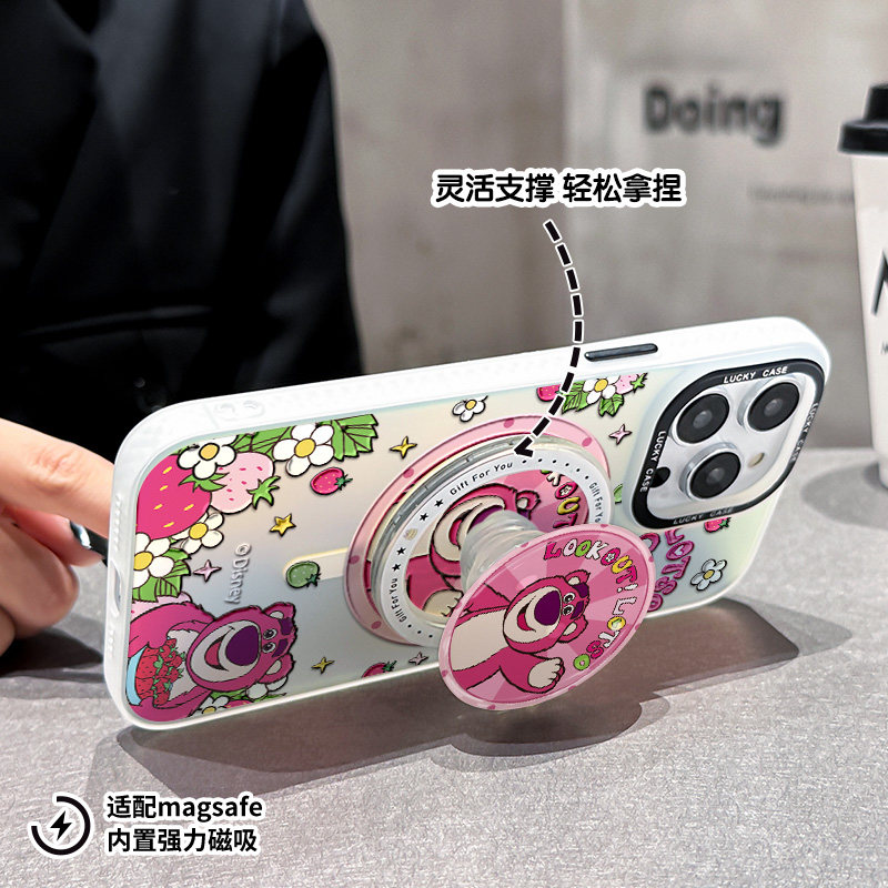 草莓粉熊适用iPhone16Pro手机壳14磁吸支架苹果15保护套女ip17promax网红卡包13可爱plus全包防摔12新款镭射