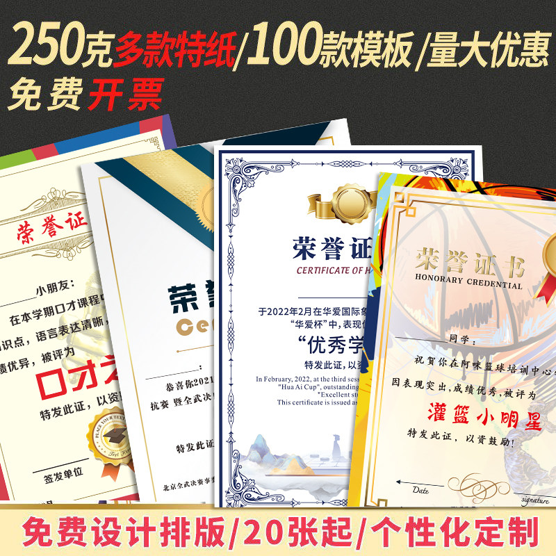 志愿荣誉获奖证书武术跆拳道舞蹈象棋篮球比赛美术证书打印内芯纸