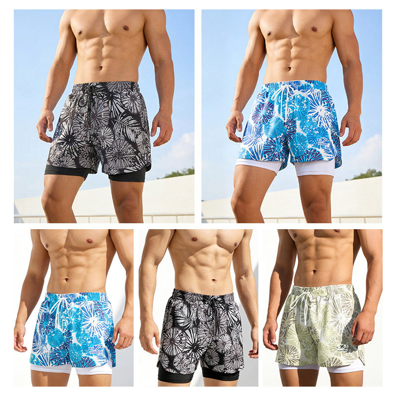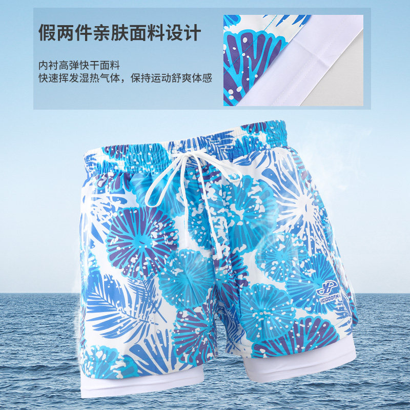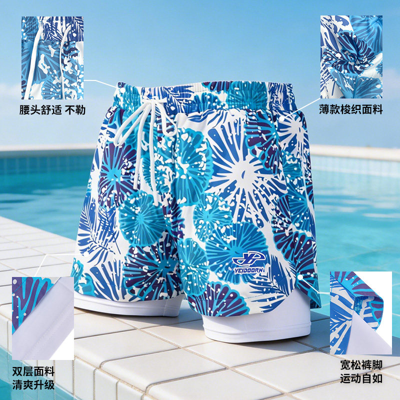 新款男士泳裤双层防尴尬平角裤加大码时尚印花沙滩裤速干游泳裤