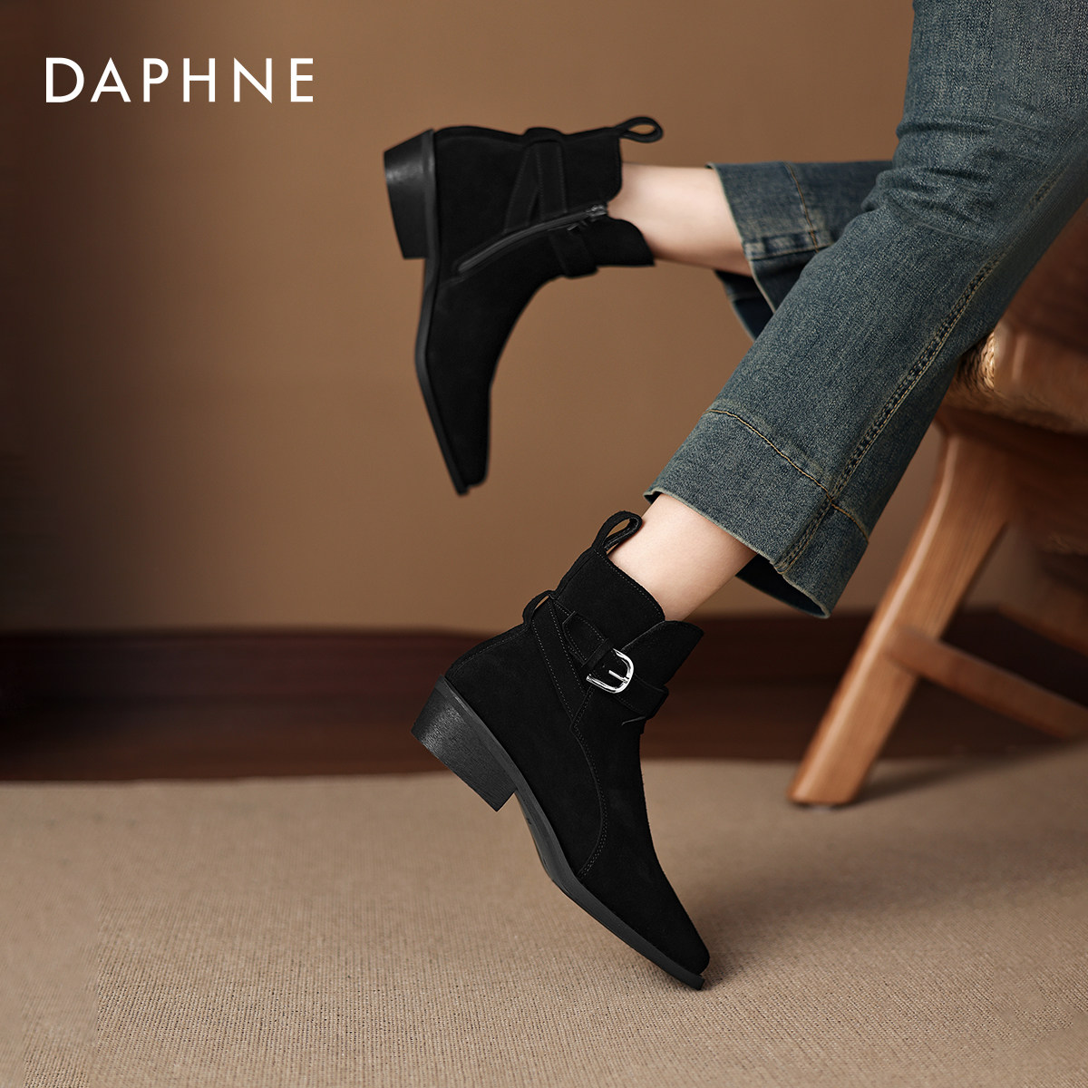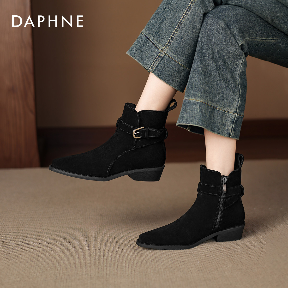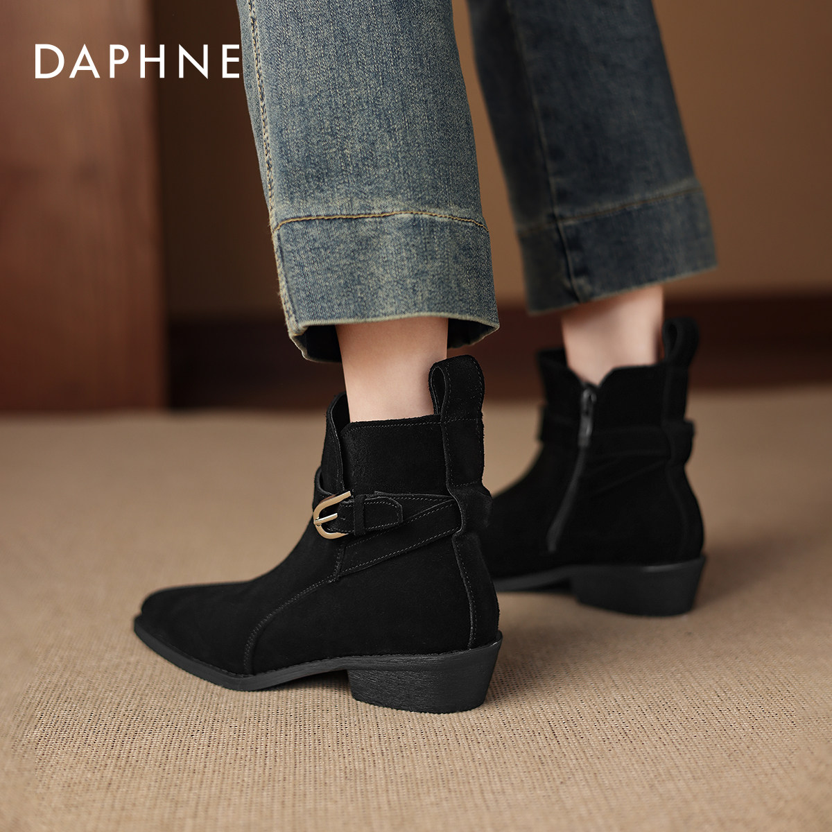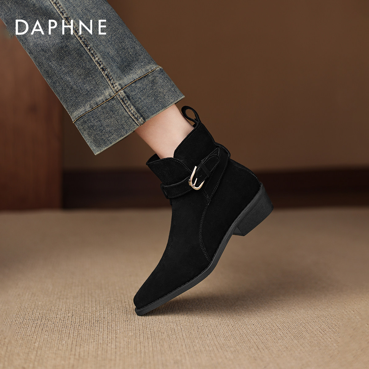 达芙妮粗跟马丁靴女2026冬新款绒面尖头短靴法式春款瘦瘦靴妈妈鞋
