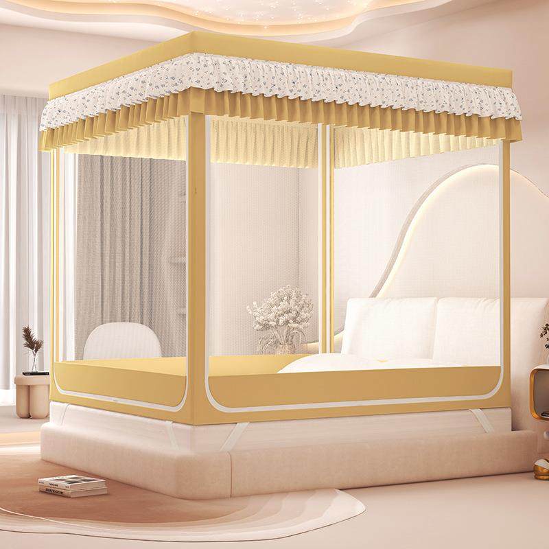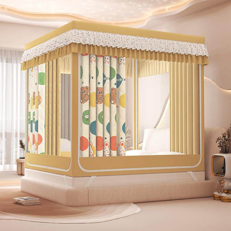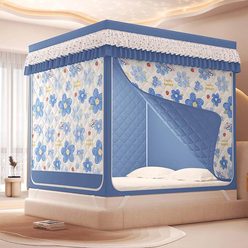 2025新款A类印花夹棉遮光帘保暖坐床蚊帐四季防蚊全遮光三开门蚊