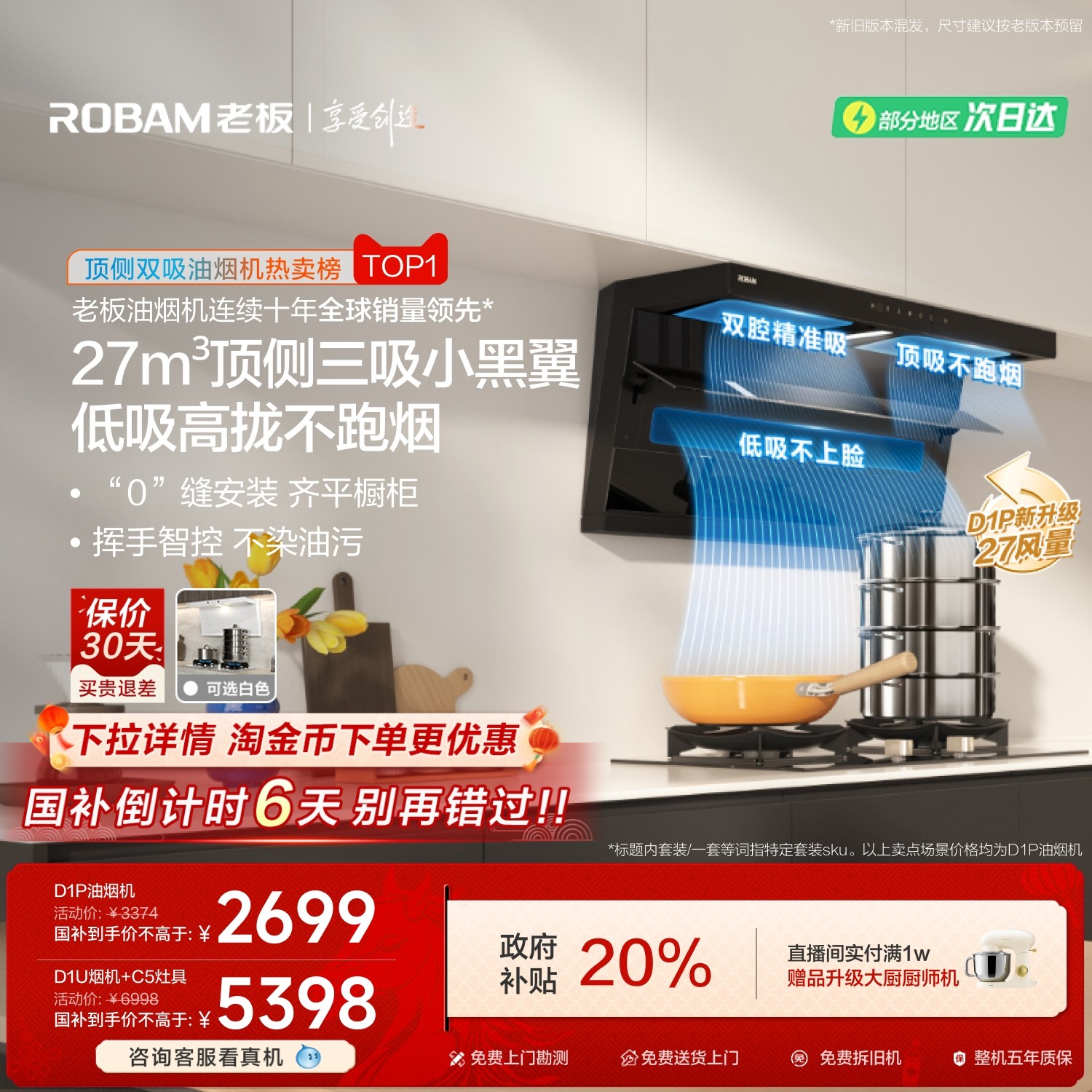 老板小黑翼D1P/D1U顶侧双吸抽油烟机燃气灶一套厨房家用官方旗舰