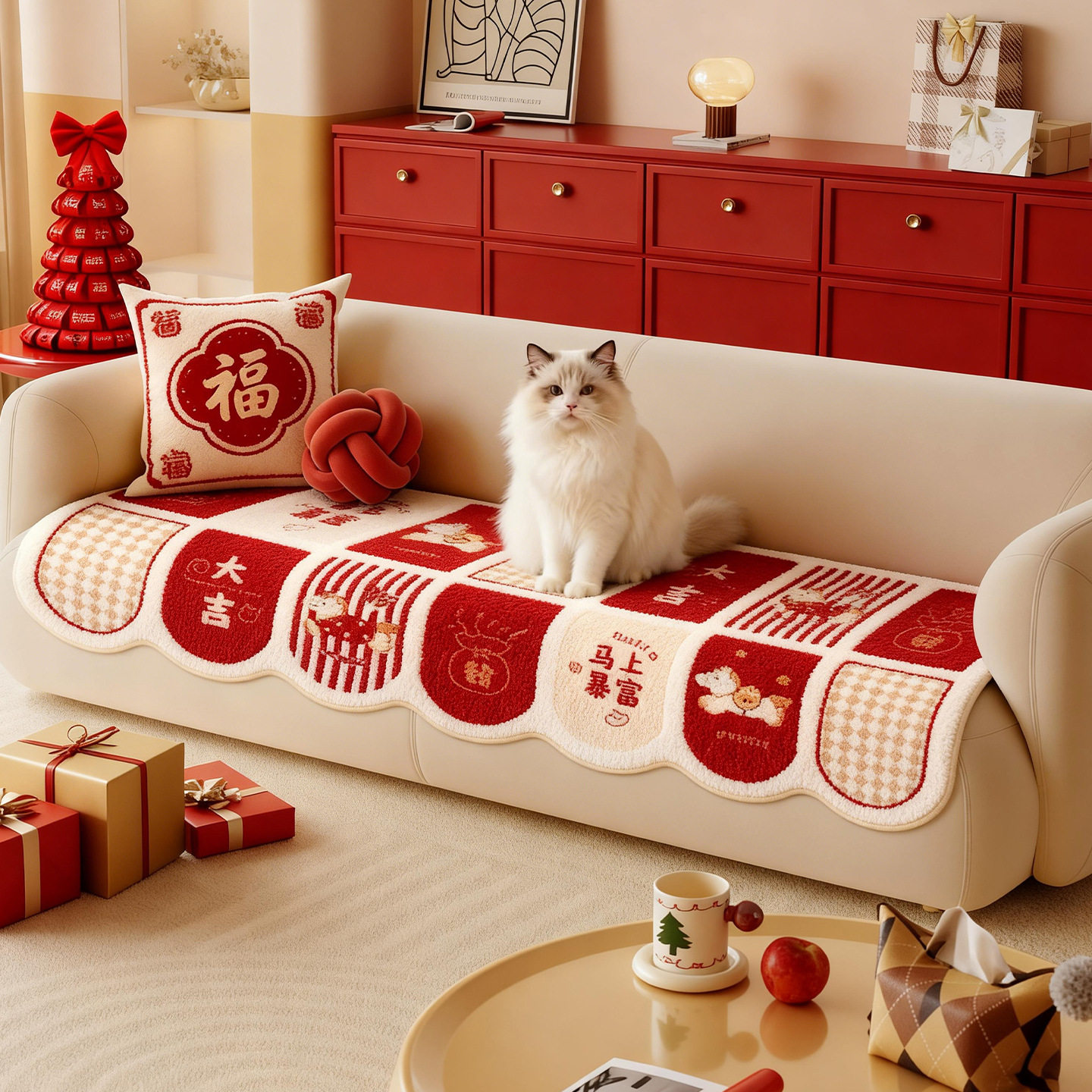 新年沙发垫节日装饰氛围感布置冬季毛绒红色喜庆格子沙发盖布毯子