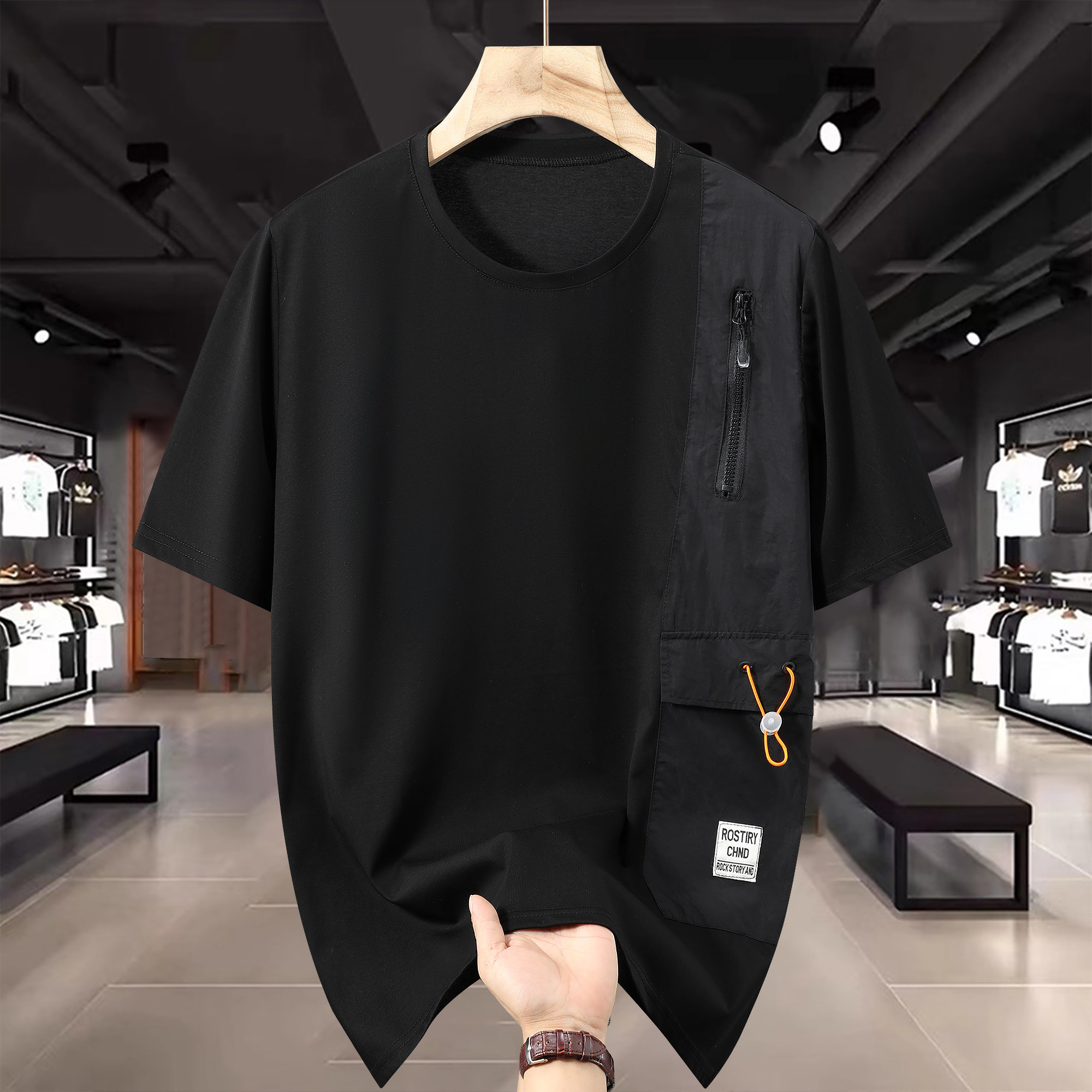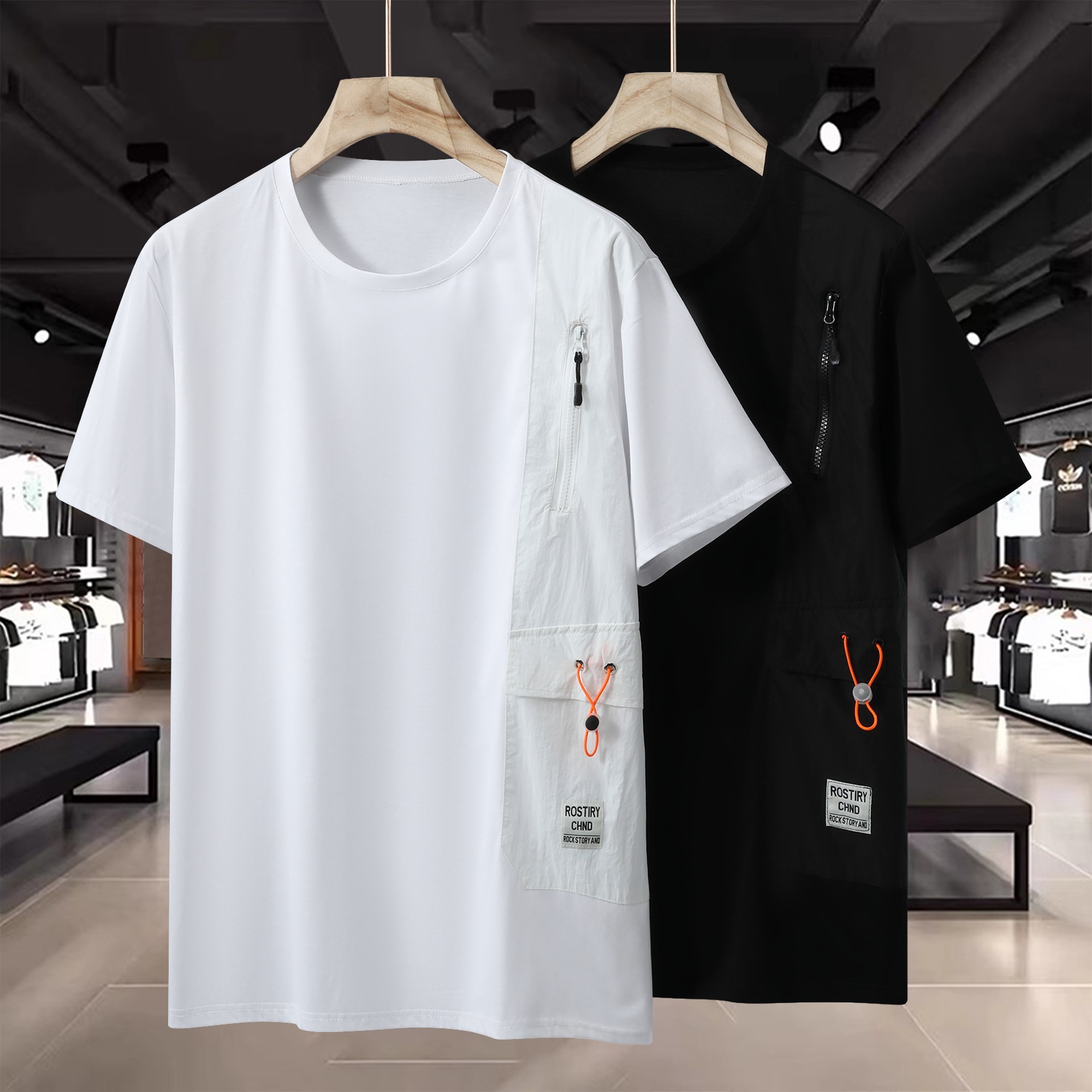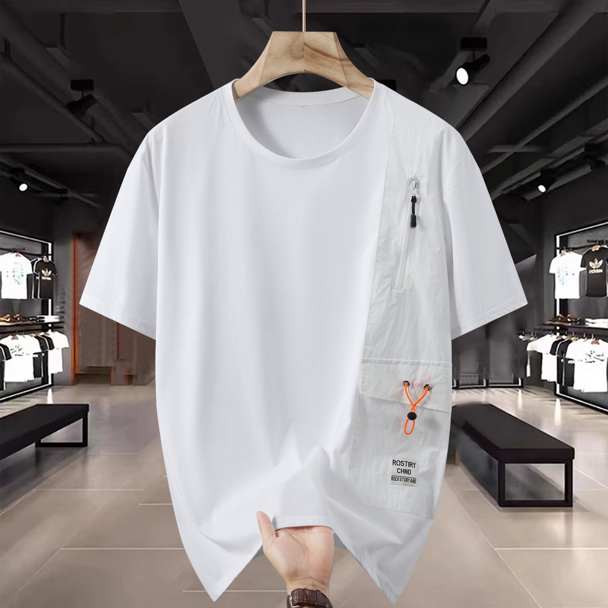 350斤大码新款短袖T恤男潮牌拉链拼接口袋新中式宽松加肥加大上衣
