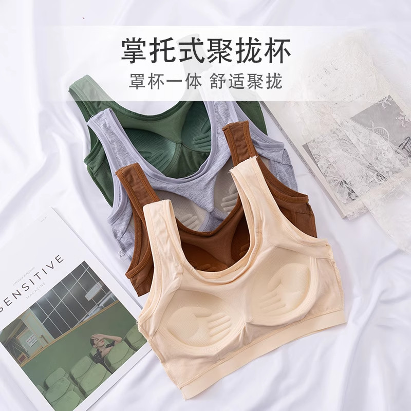 纯棉背心式舒适一体胸罩固定杯内衣防下垂防震美背聚拢文胸无钢圈