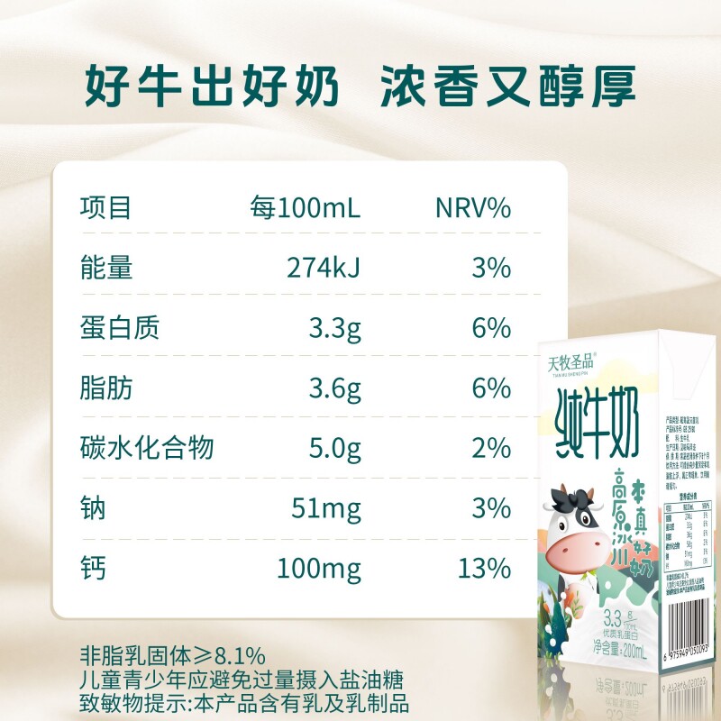 必入清单!天牧圣品优牧纯牛奶200ml*10盒3.3g蛋白营养高原生牛乳