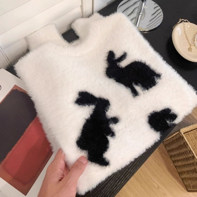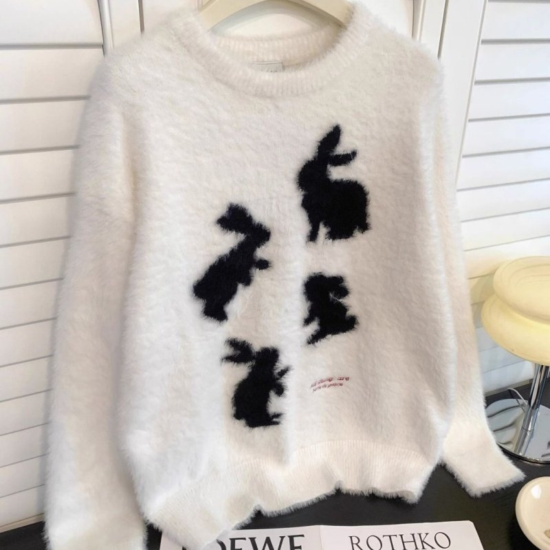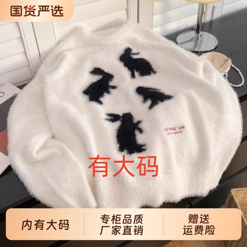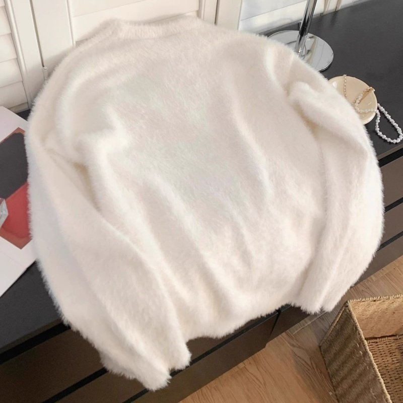 白色圆领水貂绒套头毛衣女秋季慵懒风针织衫宽松大码内搭上衣秋冬