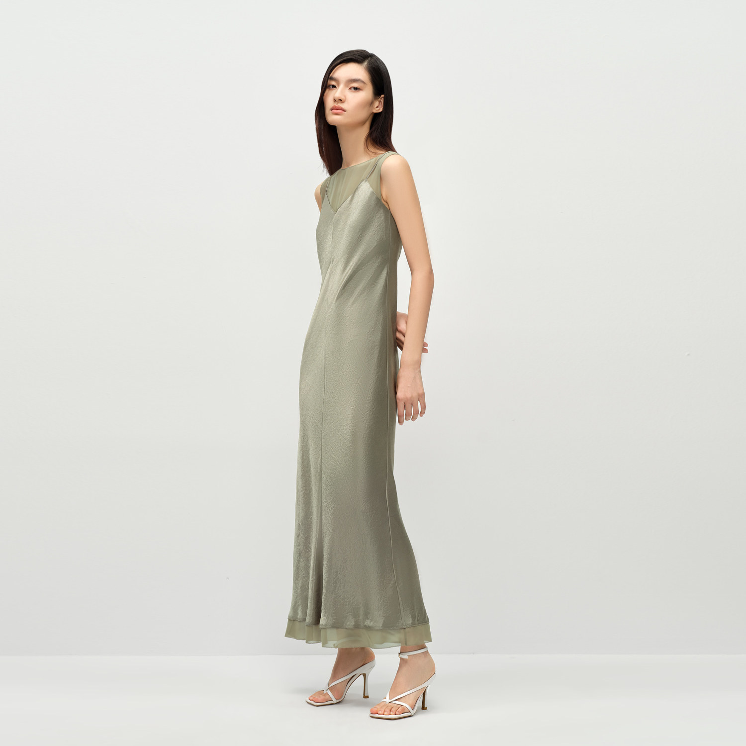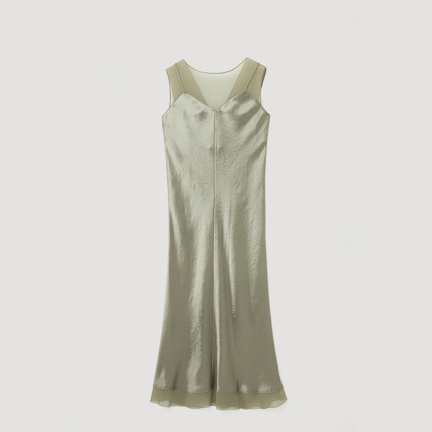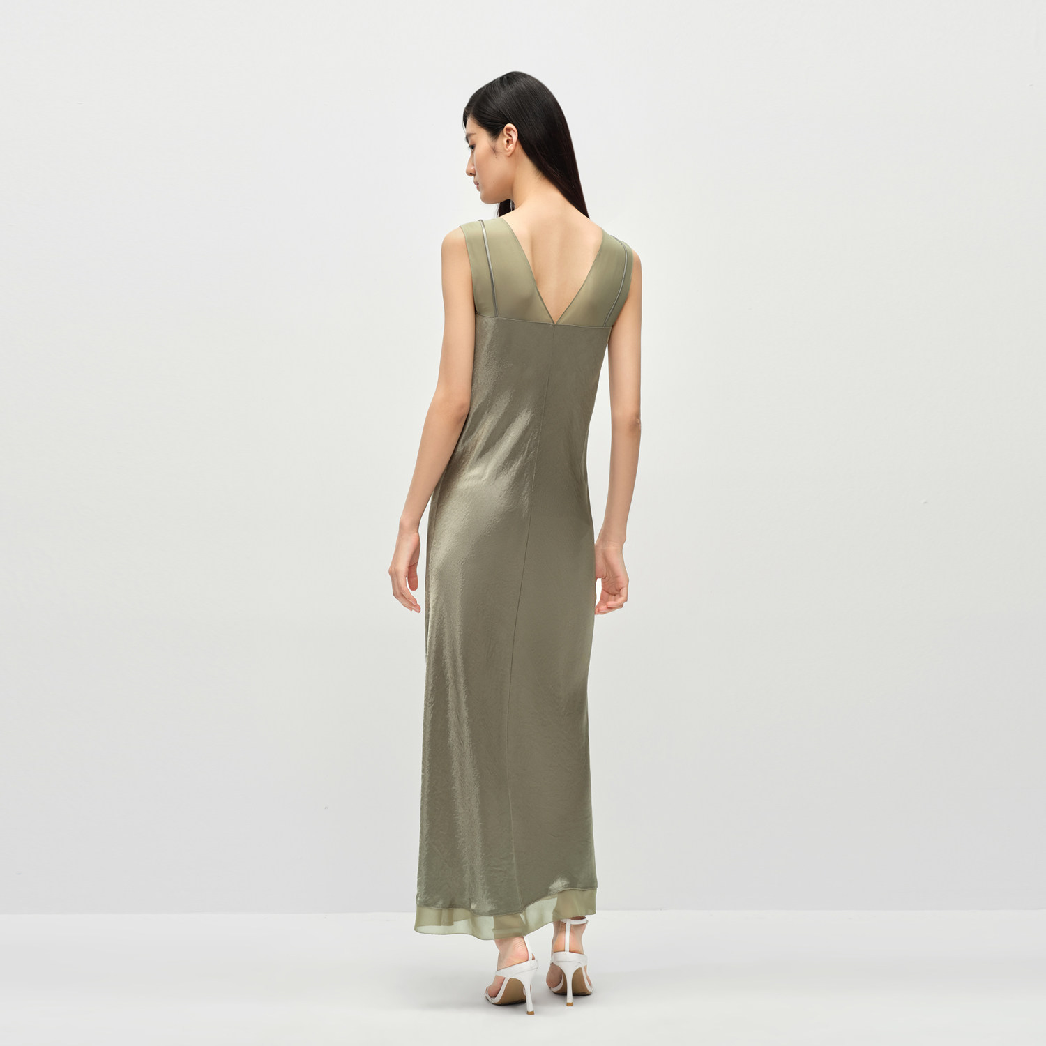 OVV2025春夏新款女装圆领雪纺纱拼接吊带缎面醋酸连衣裙