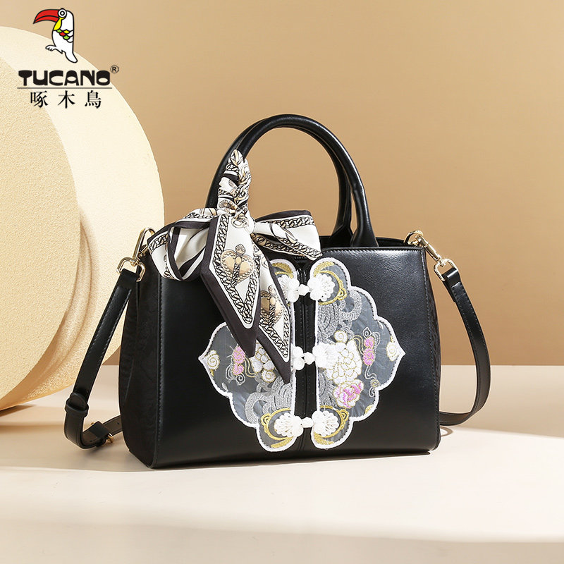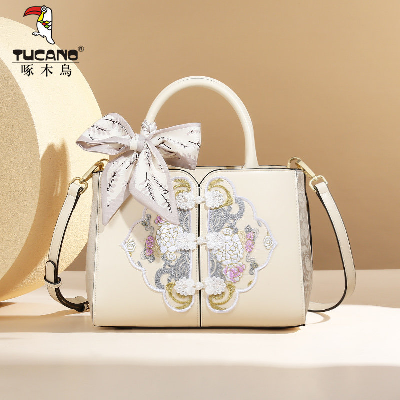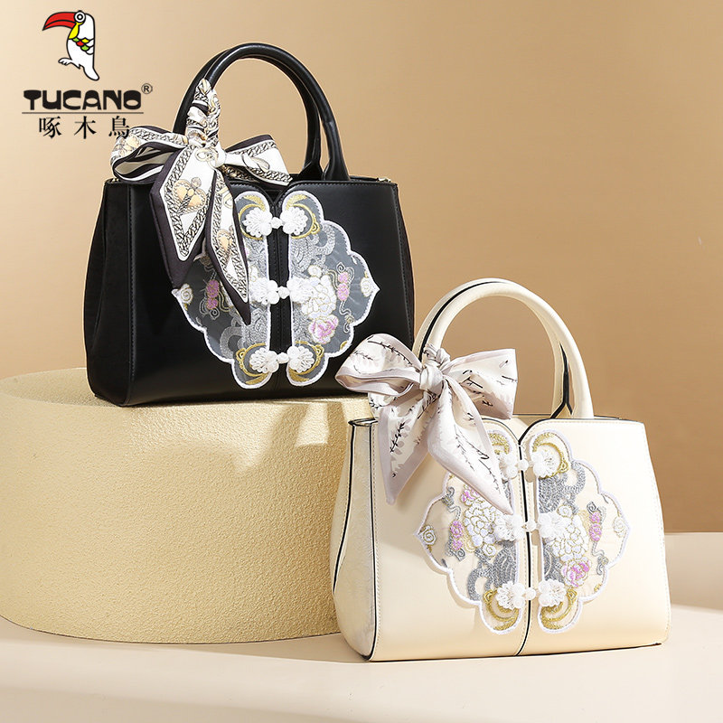 啄木鸟真皮包包女2025新款中式国风刺绣高级感轻奢小众斜挎手提包