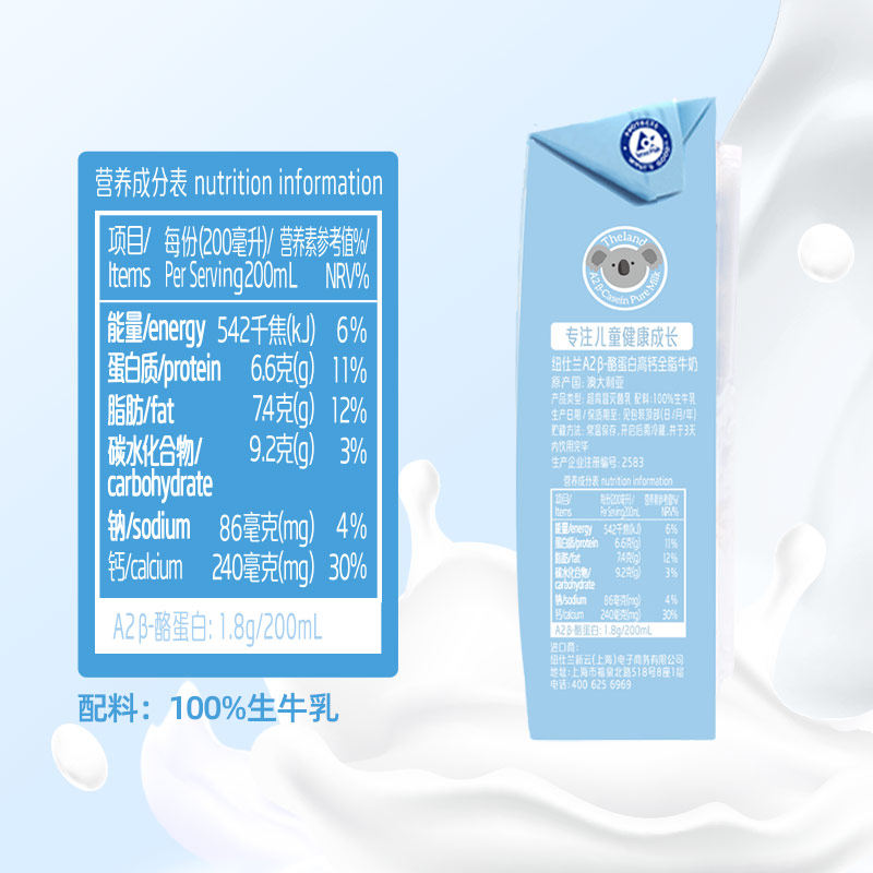 【进口】纽仕兰A2β-酪蛋白全脂高钙纯牛奶200ml*24盒早餐学生奶