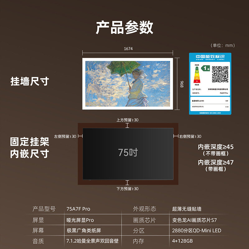 创维壁纸A7F Pro 75英寸Mini LED超薄壁画艺术电视机 焕新补贴