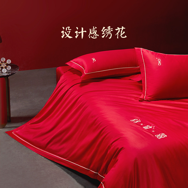 罗莱家纺结婚四件套全棉贡缎床上用品红色高端婚庆床单被套套件