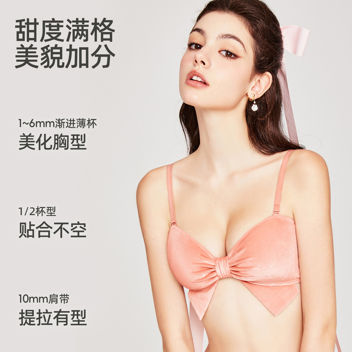 好奇蜜斯纯欲内衣女小胸无钢圈可爱法式丝绒蝴蝶结文胸罩套装薄款