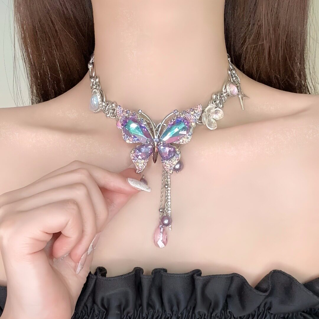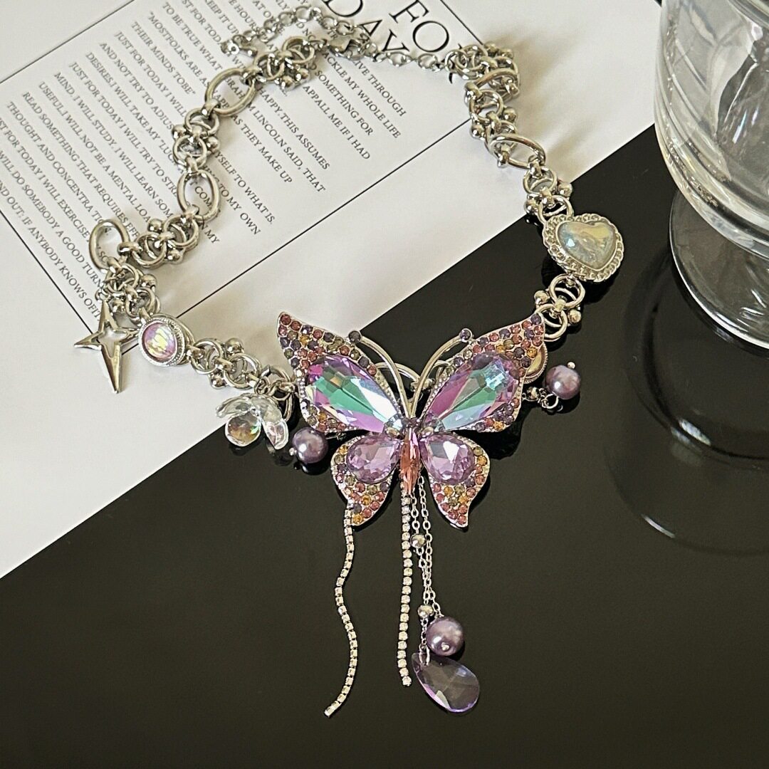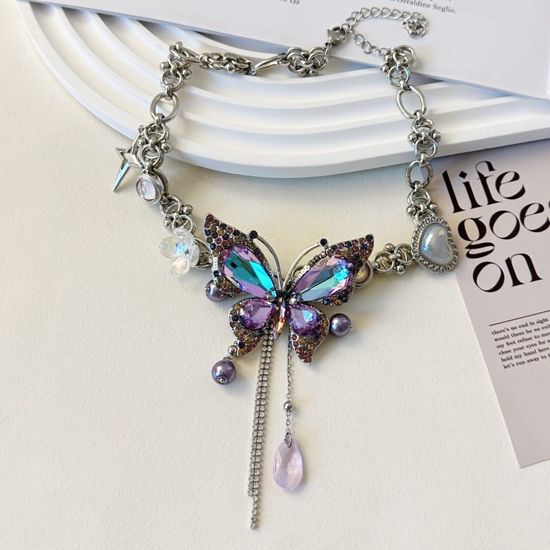 重工精致紫色满钻蝴蝶爱心流苏项链女时尚气质轻奢百搭小众锁骨链