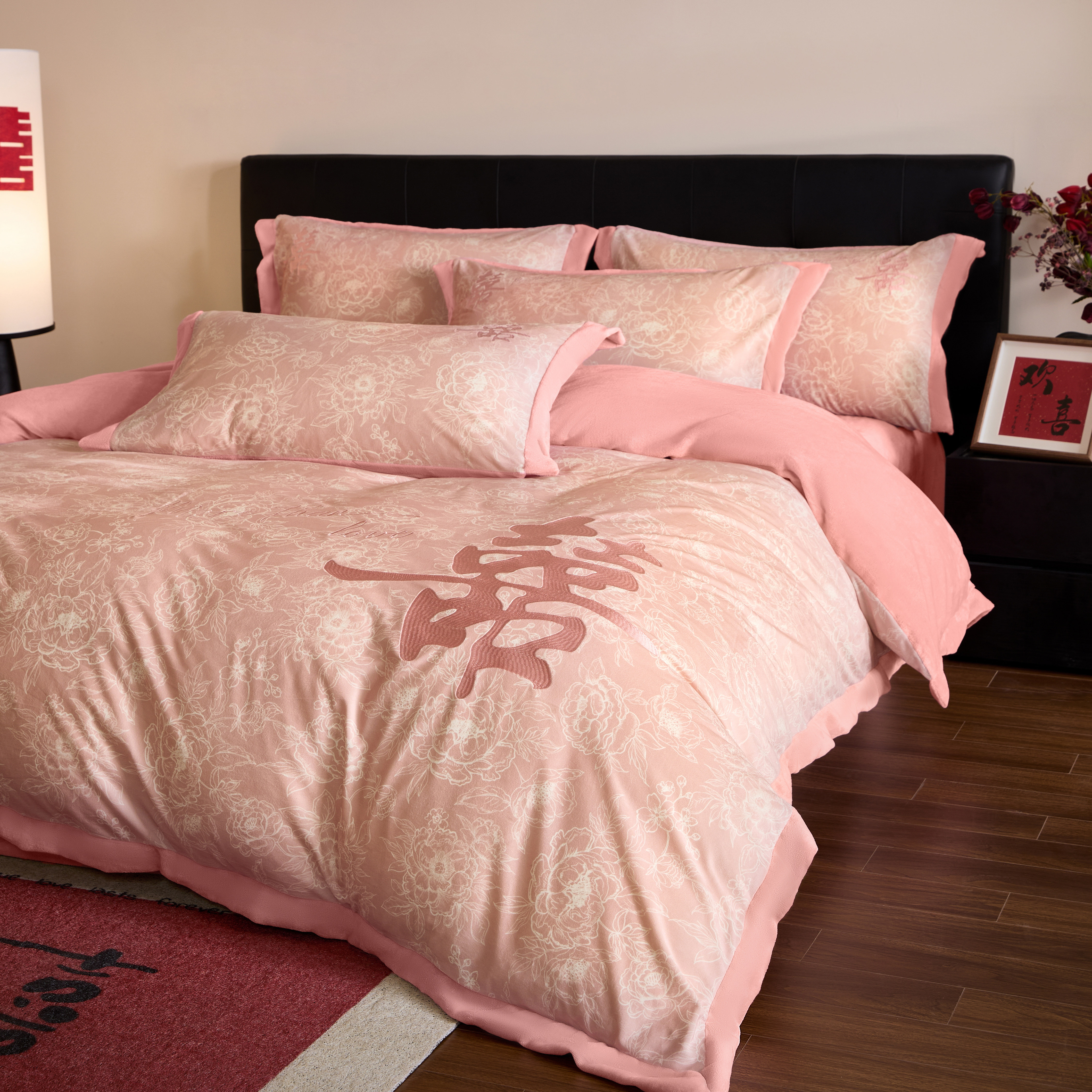 秋冬牛奶绒婚庆四件套加厚保暖中式喜字刺绣红色结婚被套床单床盖