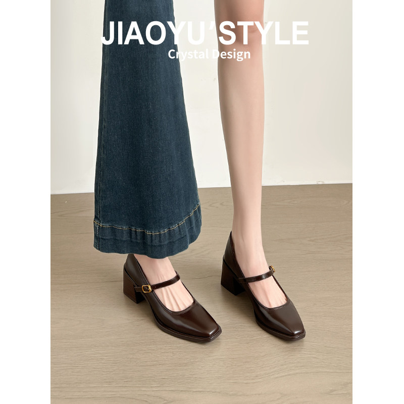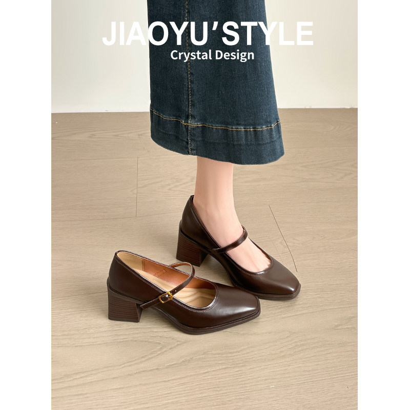 真皮~骄屿法式粗高跟鞋女2026春秋新款绝美配裙子复古玛丽珍单鞋
