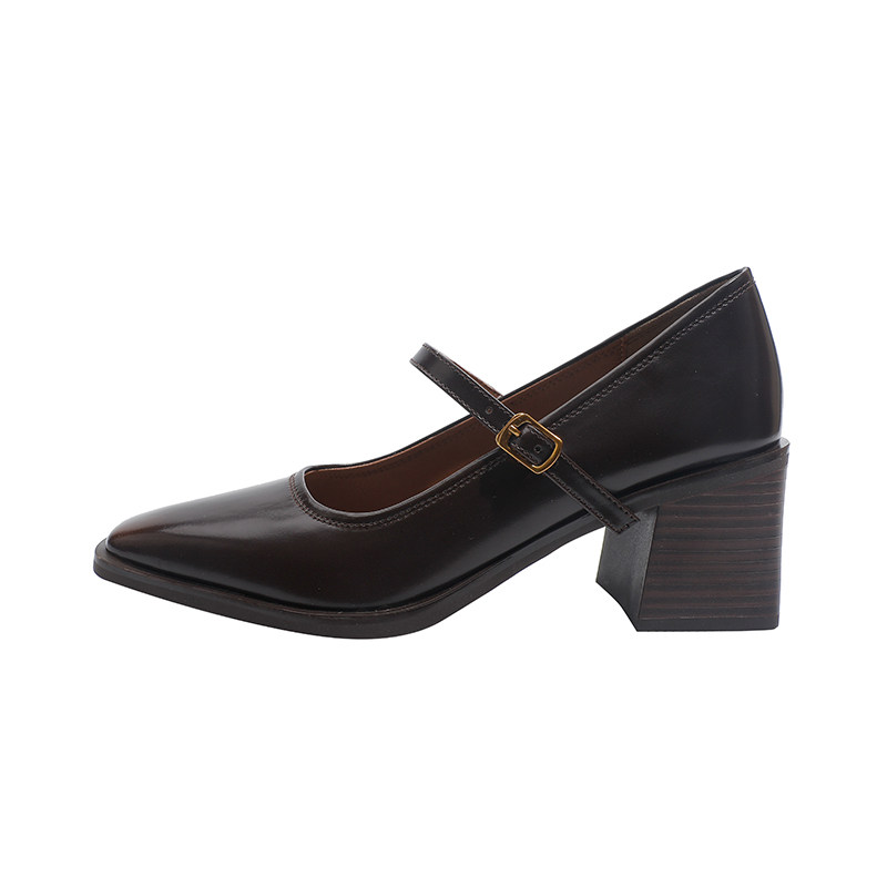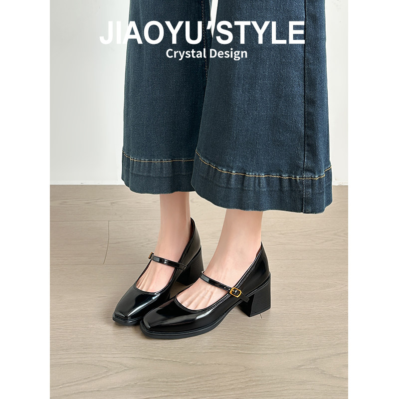 真皮~骄屿复古浅口高跟鞋山茶花一字扣粗跟单鞋尖头气质玛丽珍鞋