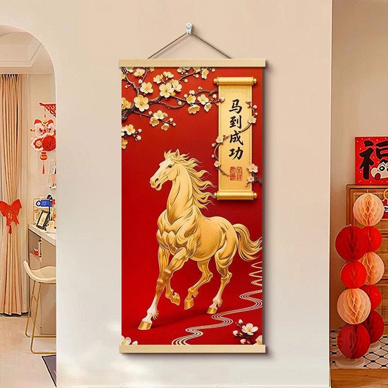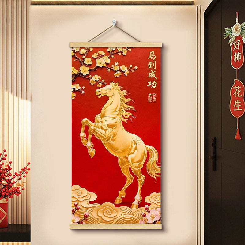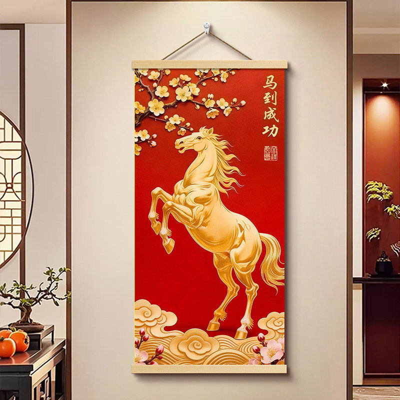马到成功2026马年玄关挂布年味布置装饰画免打孔客厅挂画卷轴墙面