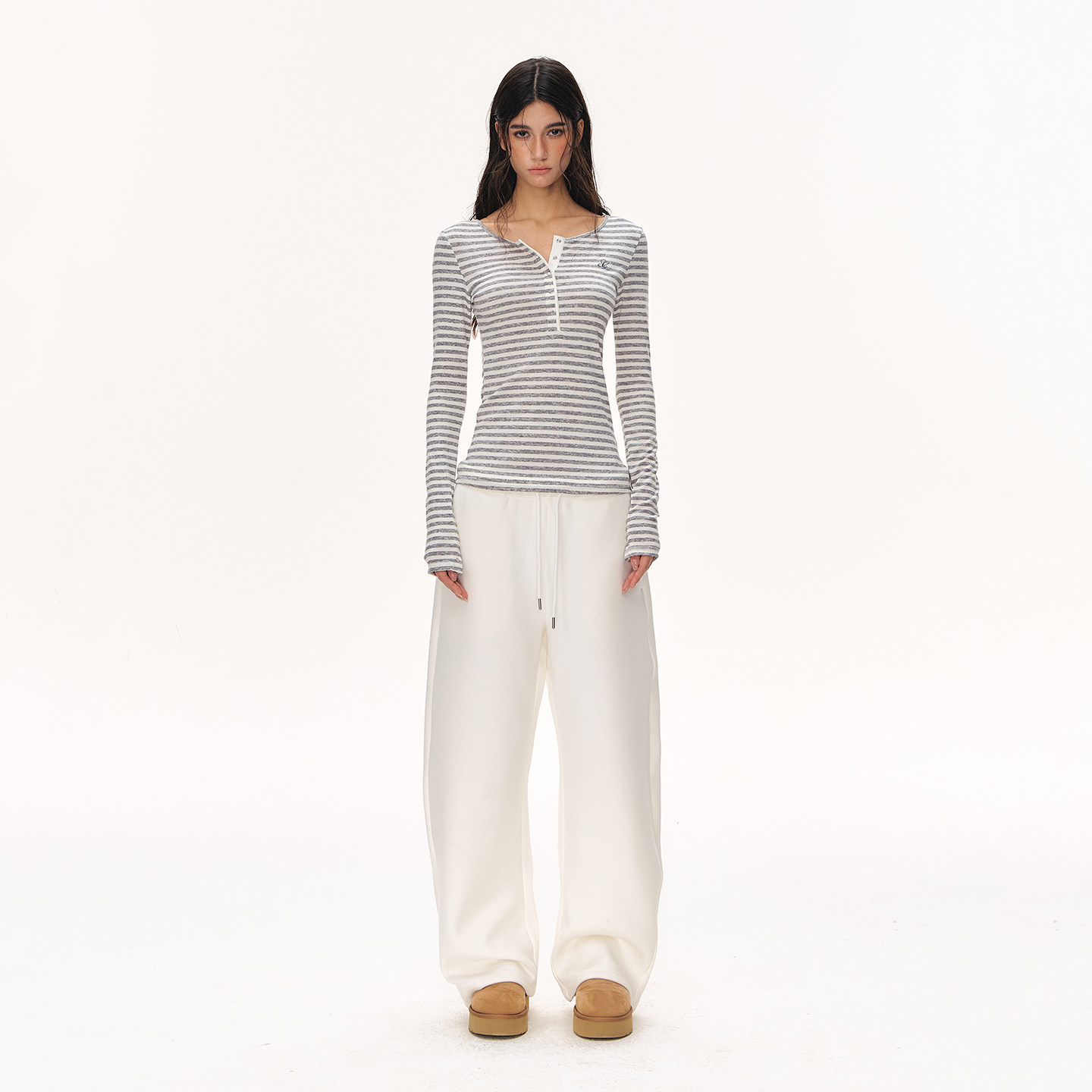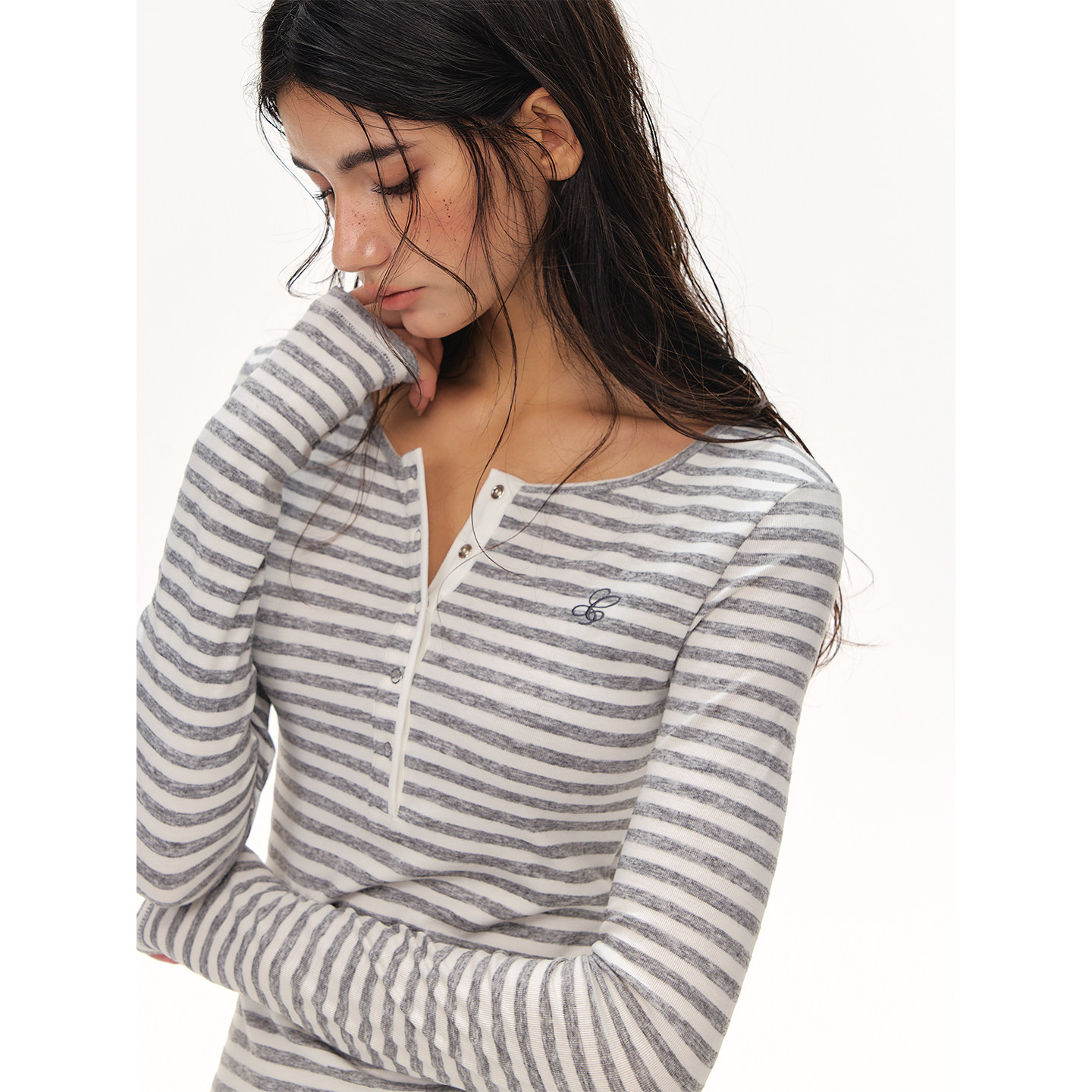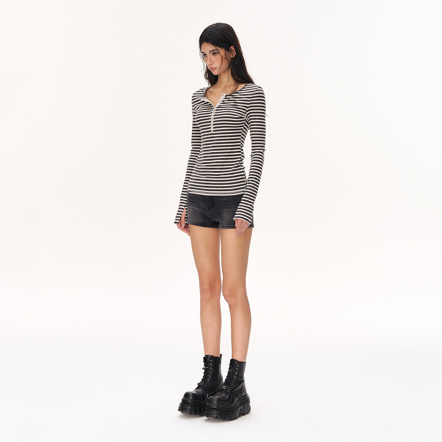 CLIMAX VISION慵懒黑白条纹半开领亨利打底衫高弹修身显瘦长袖T恤