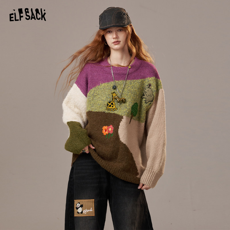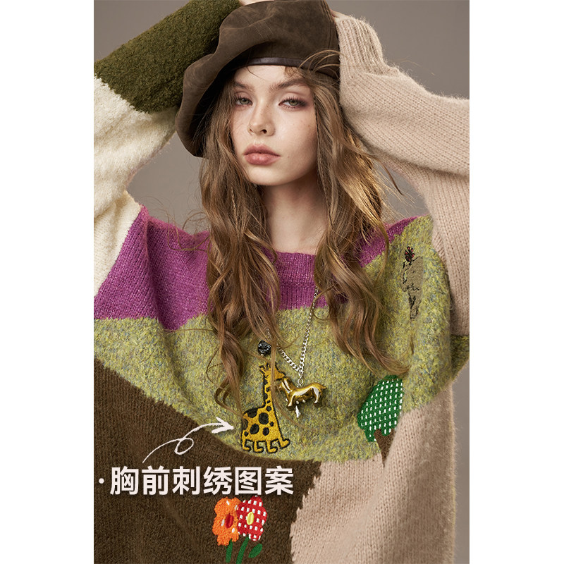 妖精的口袋趣味刺绣撞色宽松毛衣女2025年秋冬新款设计感新年穿搭