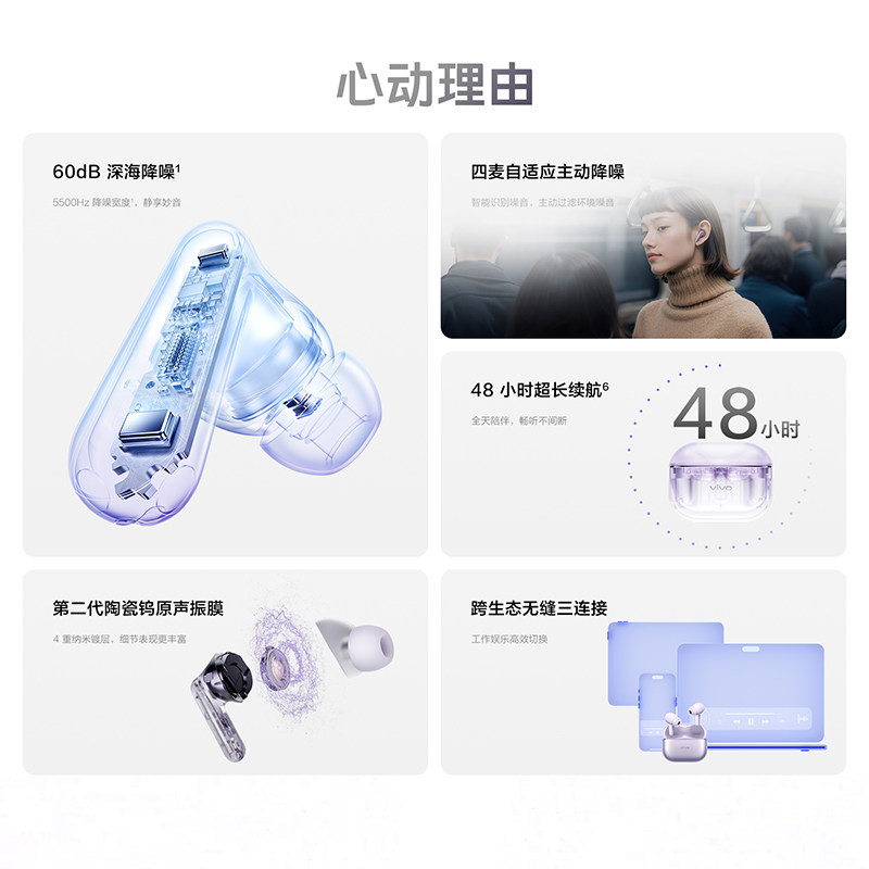 vivo TWS 5蓝牙耳机tws5入耳式60dB深度降噪HiFi音质新品vivo耳机