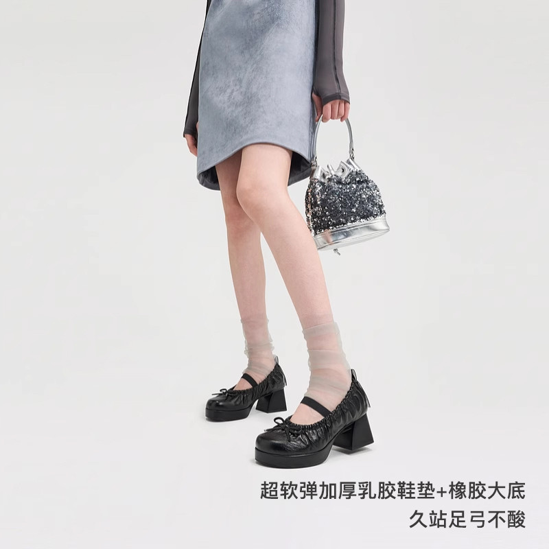 圆头粗跟抽褶芭蕾舞鞋 珊瑚纹牛皮柔软细腻