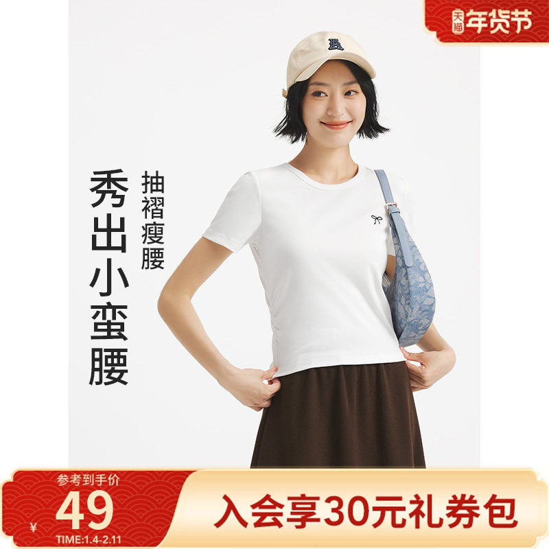 热风女士短袖T恤上衣2025年秋季新款修身蝴蝶结短T恤白色打底衫
