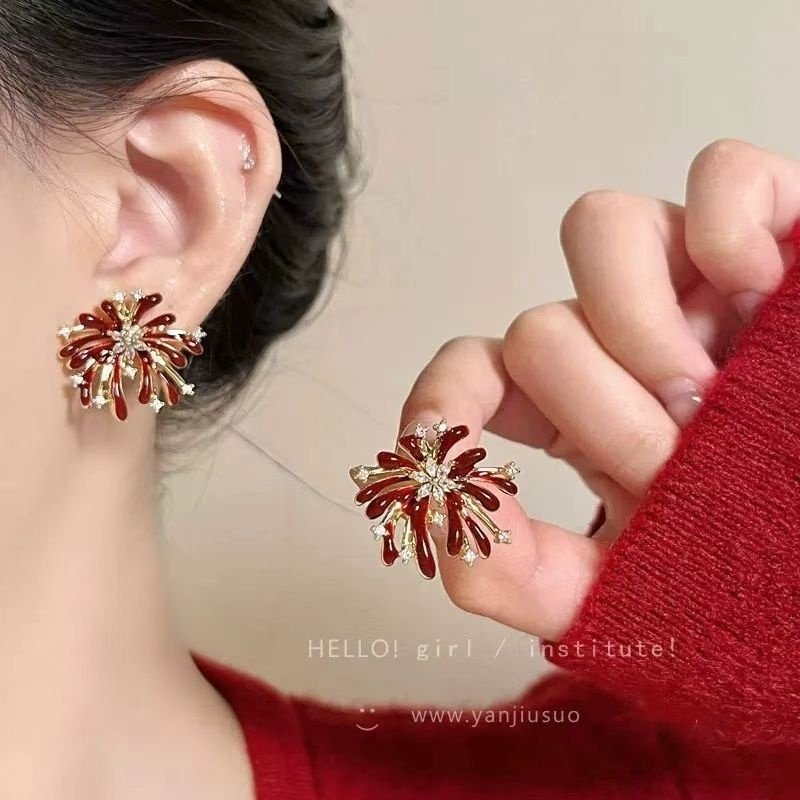 新年烟花耳钉耳夹精致小巧红色设计气质百搭轻奢耳饰女隐形蝴蝶
