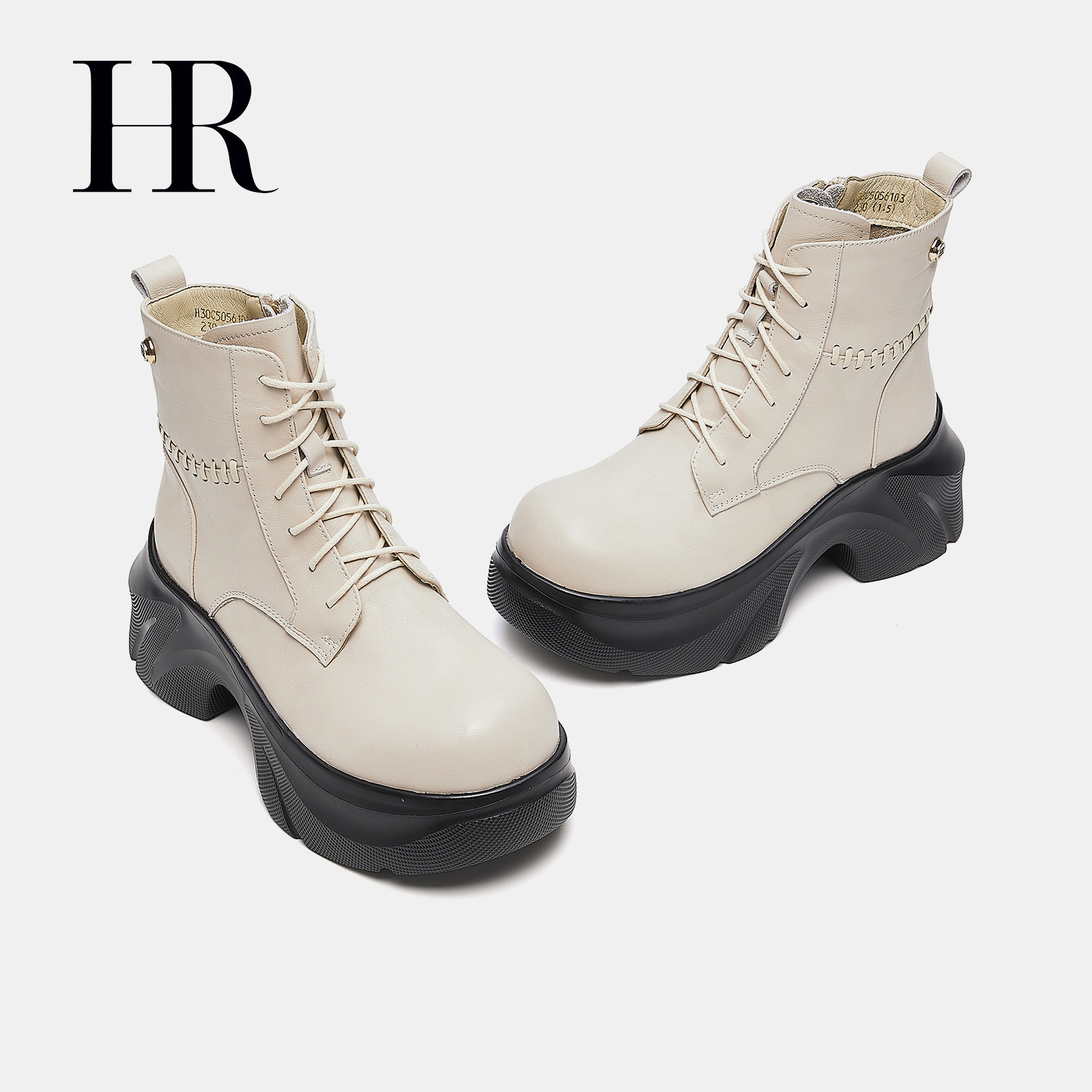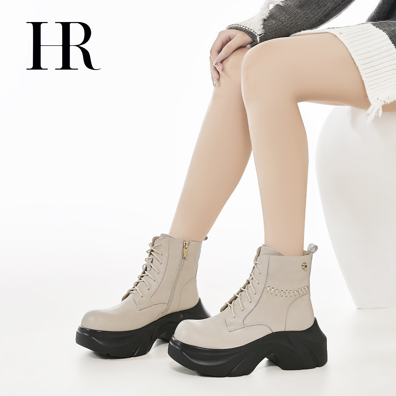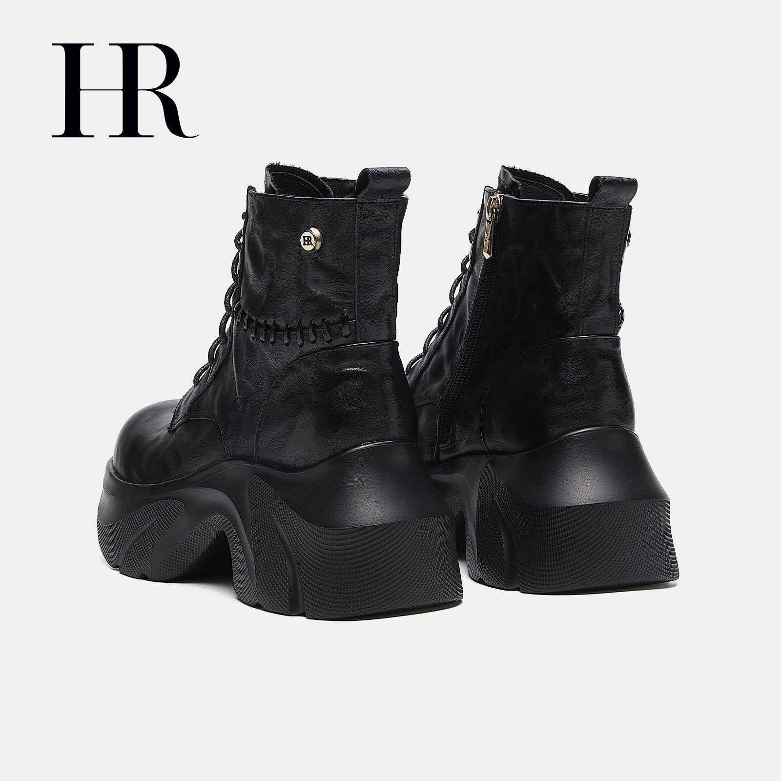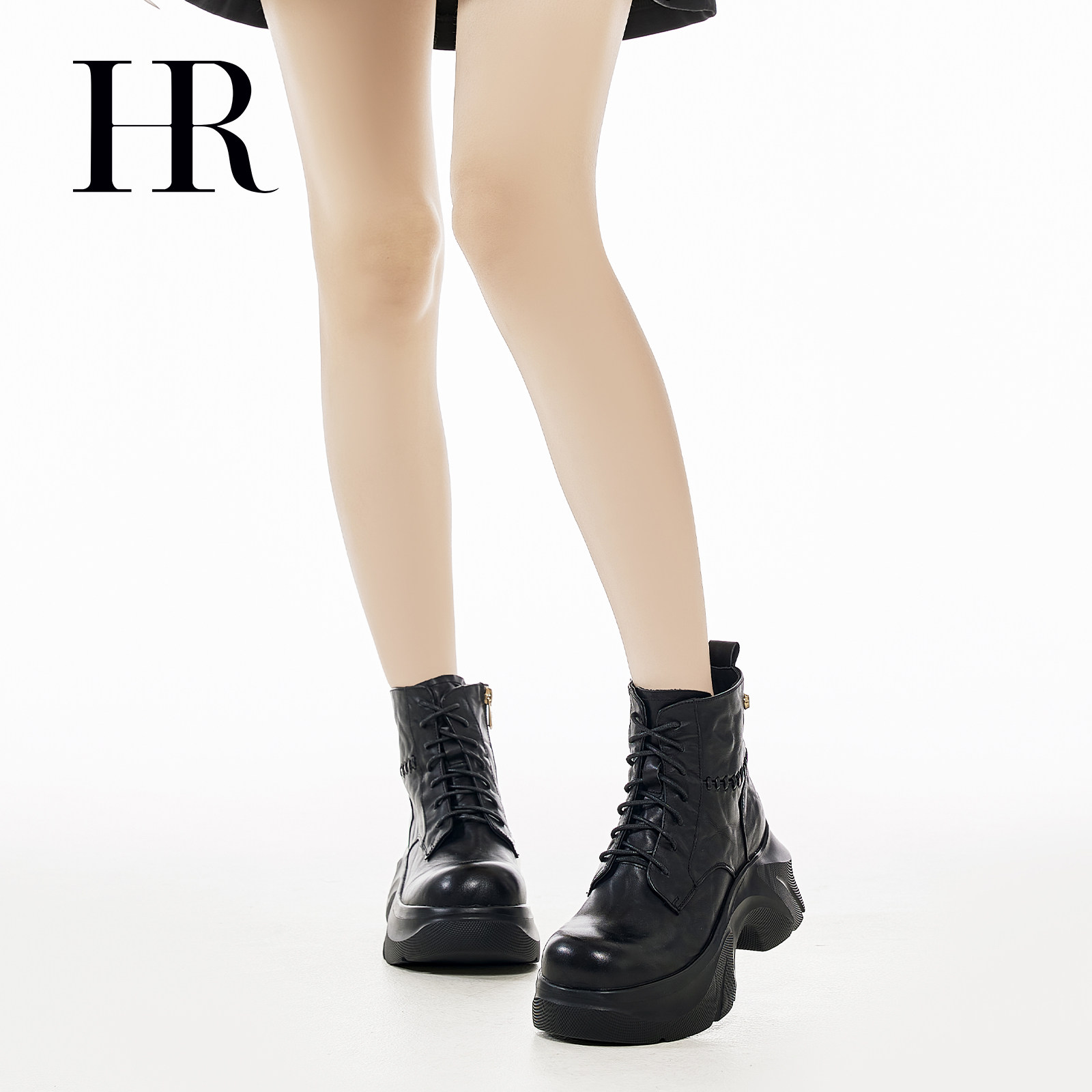 HR赫莲娜女鞋子2026冬季新款马丁靴厚底时尚复古褶皱系带短靴增高