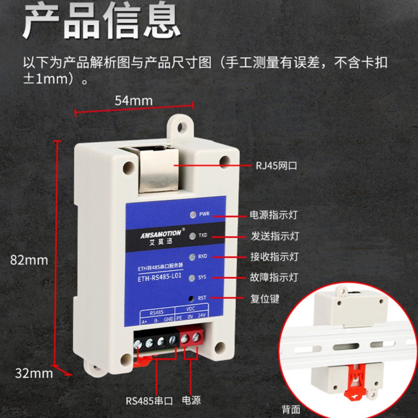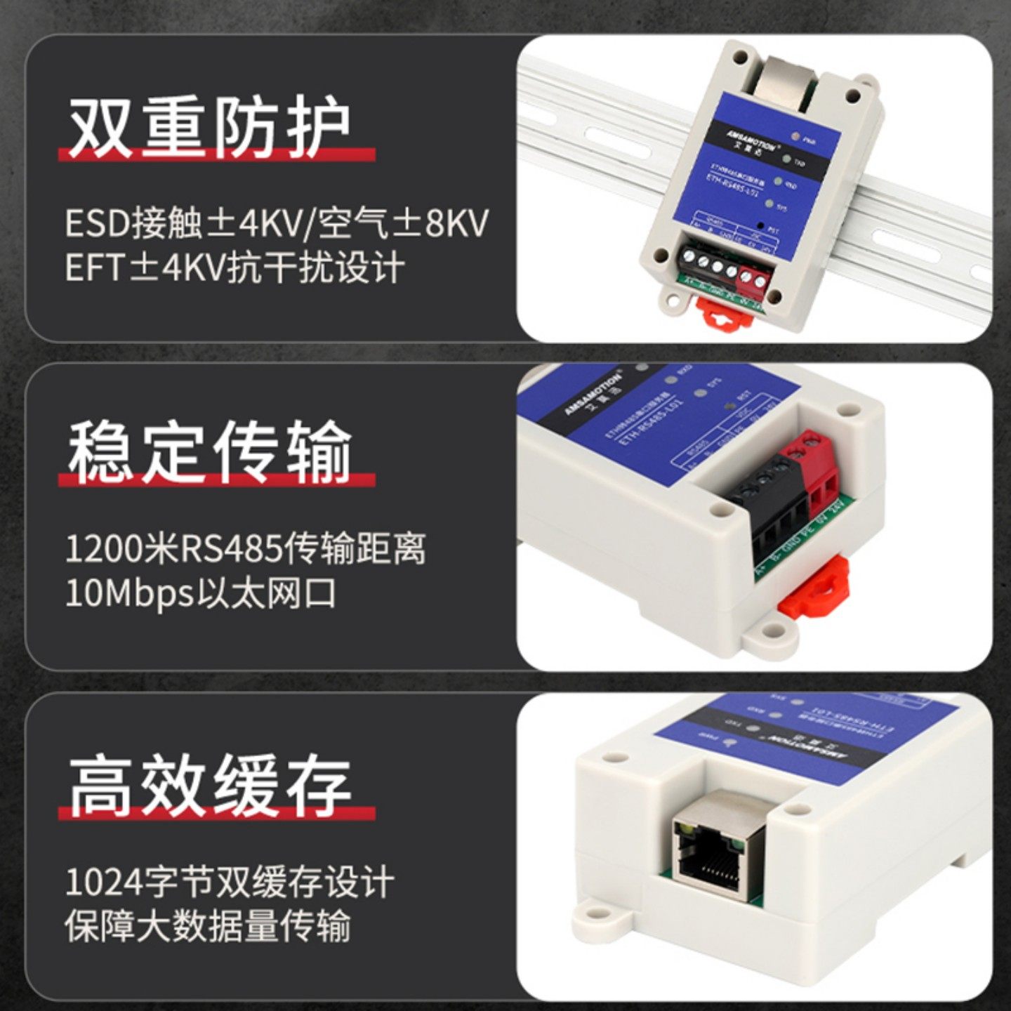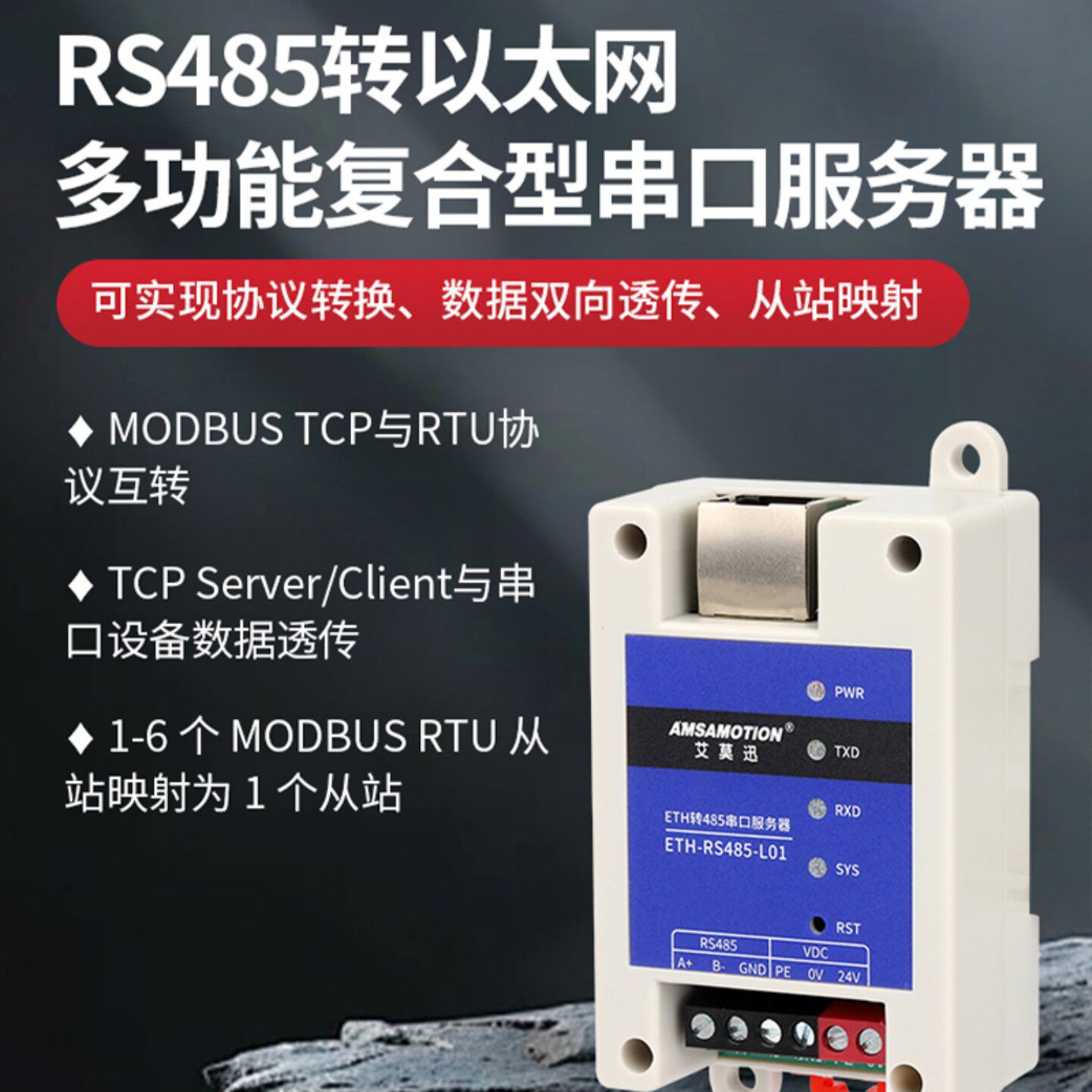艾莫迅485串口服务器转以太网网口Modbus网关TCP/IP转串口通讯rtu转tcp模块ETH-RS485L