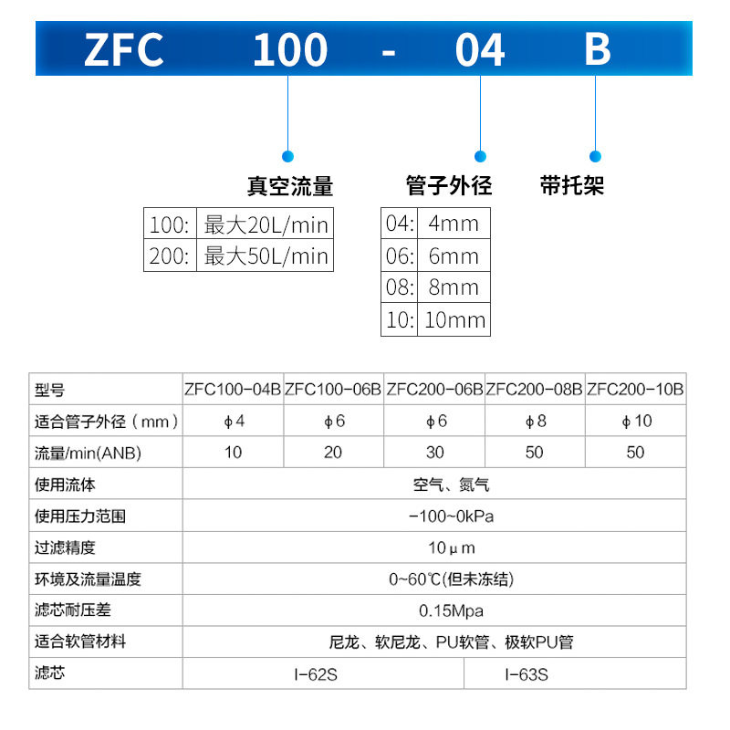 ZFC100-06B气动负压管道型空气真空过滤器200-08B小型ZFC54-B滤芯