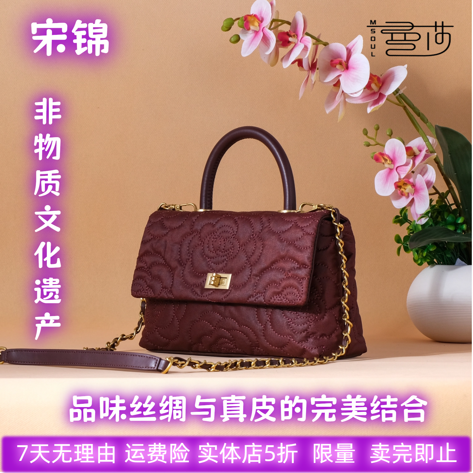 曼莎中国风宋锦香云纱手提单肩斜挎刺绣真丝牛皮手提女包2649